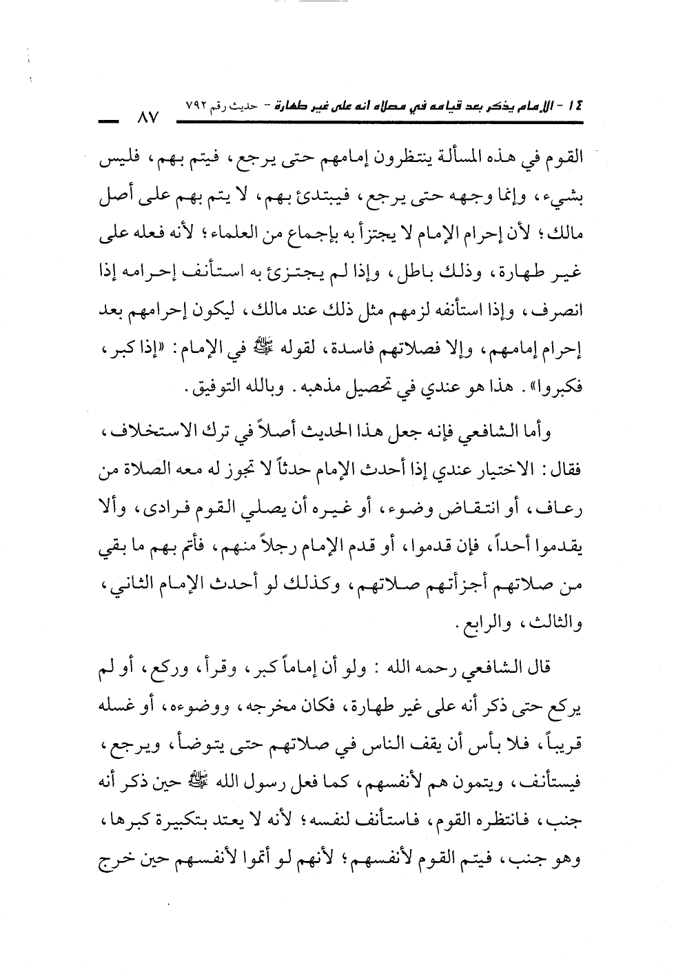 وأما الشافعي فإنه جعل هذا الحديث أصلاً في ترك الاستخلاف، فقال: الاختيار عندي إذا أحدث الإمام حدثاً لا تجوز له معه الصلاة من رعاف، أو انتقاض وضوء، أو غيره أن يصلي القوم فرادى، وألا يقدموا أحداً، فإذ قدموا، أو قدم الإمام رجلاً منهم، فأتم بهم ما بقي من صلاتهم أجزأتهم صلاتهم، وكذلك لو أحدث الإمام الثاني، والثالث، والرابع.