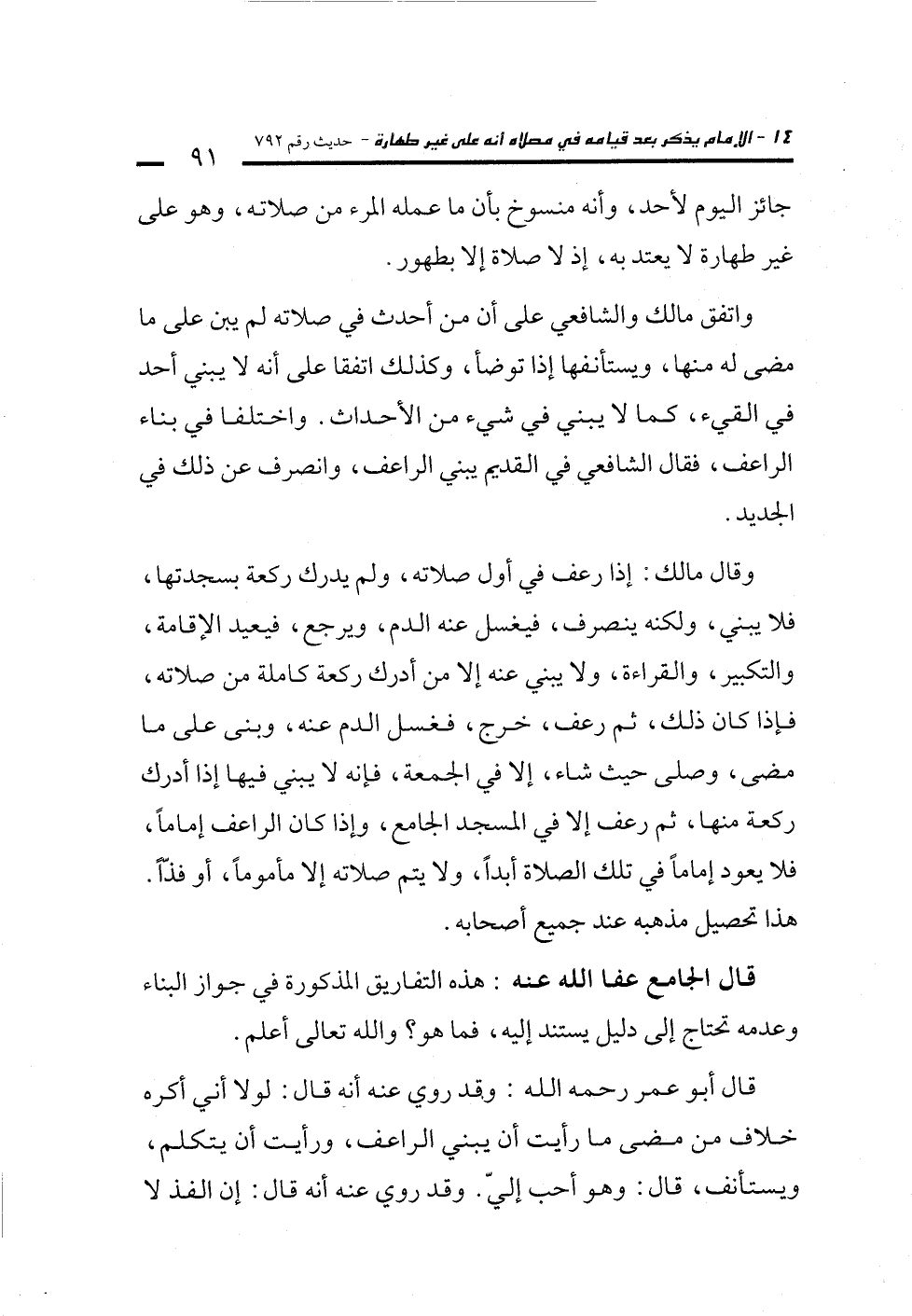 قال أبو عمر رحمه الله: وقد روي عنه أنه قال: لولا أني أكره خلاف من مضى ما رأيت أن يبني الراعف، ورأيت أن يتكلم، ويستأنف، قال: وهو أحب إليّ. وقد روي عنه أنه قال: إن الفذ لا