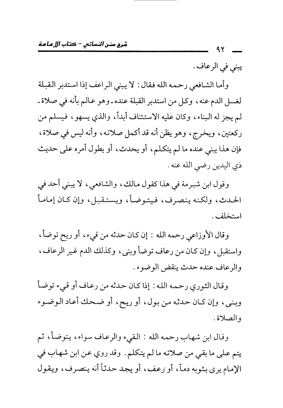 وأما الشافعي رحمه الله فقال: لا يبني الراعف إذا استدبر القبلة لغسل الدم عنه، وكل من استدبر القبلة عنده -وهو عالم بأنه في صلاة- لم يجز له البناء، وكان عليه الاستئناف أبداً، والذي يسهو، فيسلم من ركعتين، ويخرج، وهو يظن أنه قد أكمل صلاته، وأنه ليس في صلاة، فإن هذا يبني عنده ما لم يتكلم، أو يحدث، أو يطول أمره على حديث ذي اليدين رضي الله عنه.