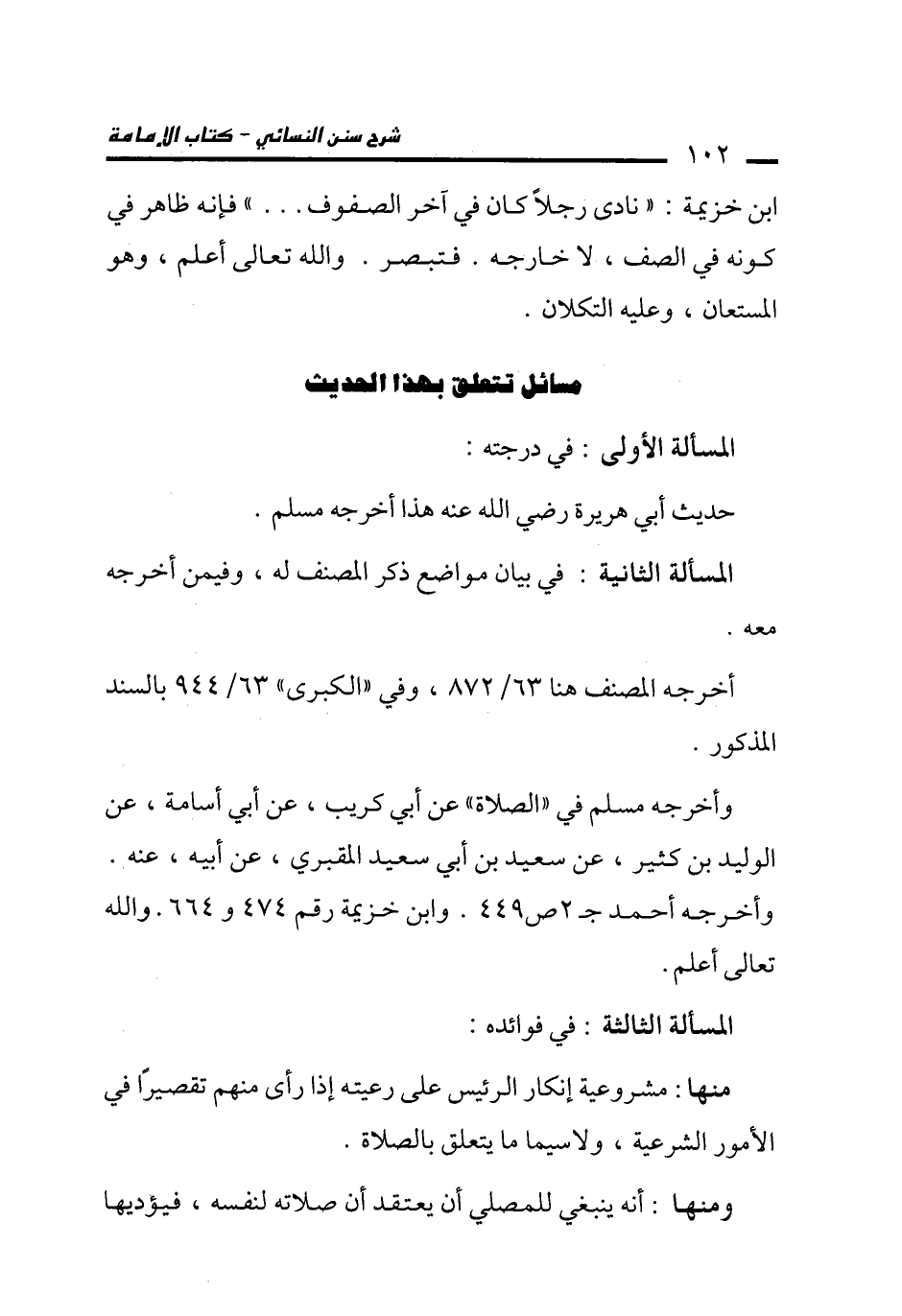 ابن خزيمة: "نادى رجلاً كان في آخر الصفوف ... " فإنه ظاهر في كونه في الصف، لا خارجه. فتبصر. والله تعالى أعلم، وهو المستعان، وعليه التكلان.