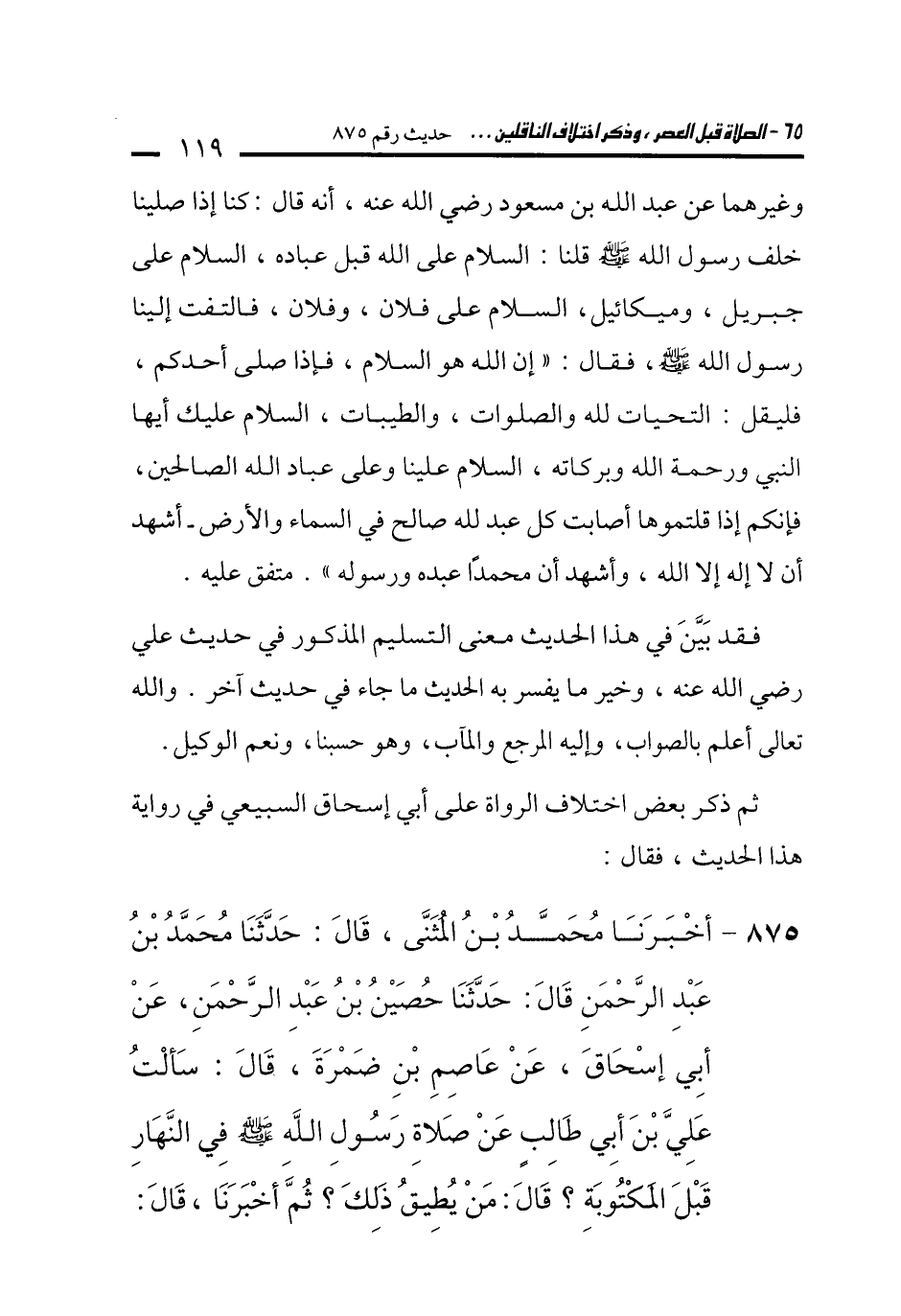 875 - أَخْبَرَنَا مُحَمَّدُ بْنُ الْمُثَنَّى، قَالَ: حَدَّثَنَا مُحَمَّدُ بْنُ عَبْدِ الرَّحْمَنِ قَالَ: حَدَّثَنَا حُصَيْنُ بْنُ عَبْدِ الرَّحْمَنِ، عَنْ أَبِي إِسْحَاقَ، عَنْ عَاصِمِ بْنِ ضَمْرَةَ، قَالَ: سَأَلْتُ عَلِيَّ بْنَ أَبِي طَالِبٍ عَنْ صَلاَةِ رَسُولِ اللَّهِ -صلى الله عليه وسلم- فِي النَّهَارِ قَبْلَ الْمَكْتُوبَةِ؟ قَالَ: مَنْ يُطِيقُ ذَلِكَ؟ ثُمَّ أَخْبَرَنَا، قَالَ: