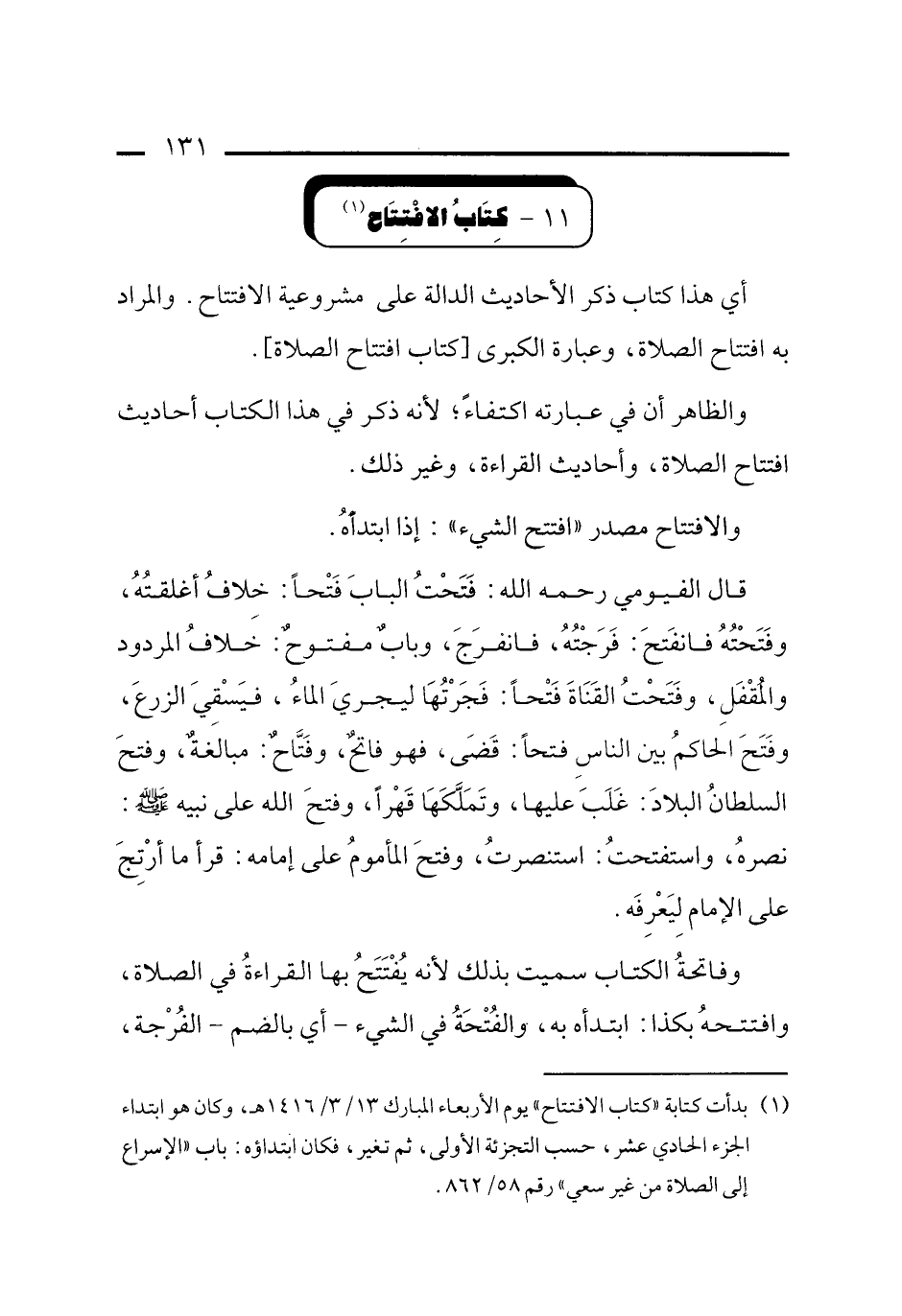 (¬1) بدأت كتابة "كتاب الافتتاح" يوم الأربعاء المبارك 13/ 3/ 1416 هـ، وكان هو ابتداء الجزء الحادي عشر، حسب التجزئة الأولى، ثم تغير، فكان ابتداؤه: باب "الإسراع إلى الصلاة من غير سعي" رقم 58/ 862.