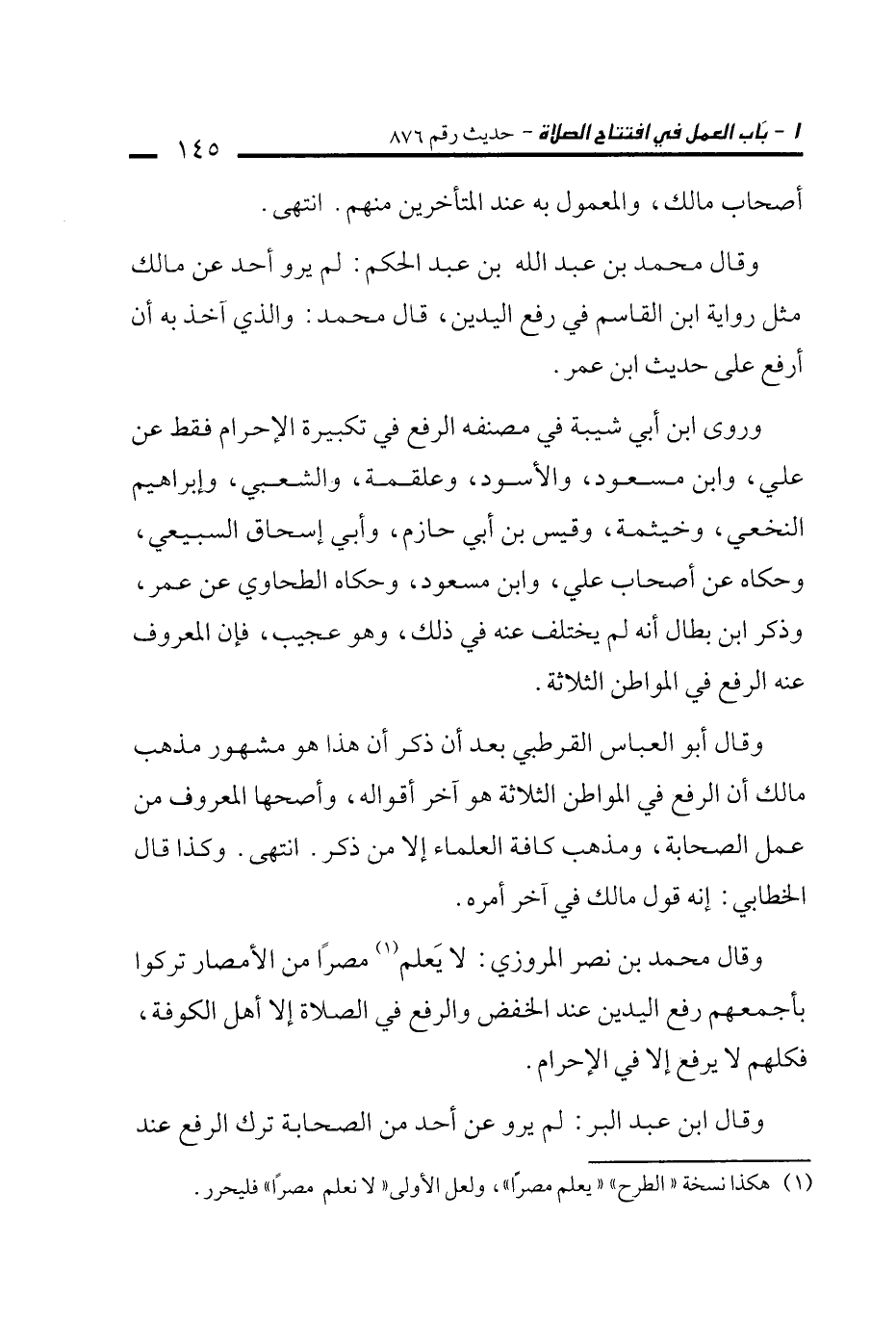 وقال ابن عبد البر: لم يرو عن أحد من الصحابة ترك الرفع عند