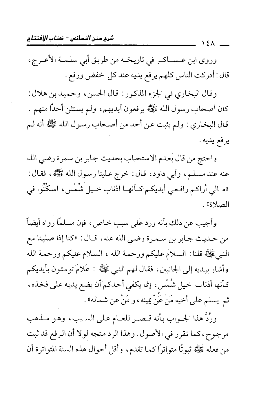 ورُدَّ هذا الجواب بأنه قصر للعام على السبب، وهو مذهب مرجوح، كما تقرر في الأصول. وهذا الرد متجه لولا أن الرفع قد ثبت من فعله -صلى الله عليه وسلم- ثبوتًا متواترًا كما تقدم، وأقل أحوال هذه السنة المتواترة أن