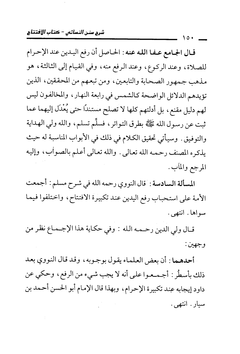 المسألة السادسة: قال النووي رحمه الله في شرح مسلم: أجمعت الأمة على استحباب رفع اليدين عند تكبيرة الافتتاح، واختلفوا فيما سواها. انتهى.