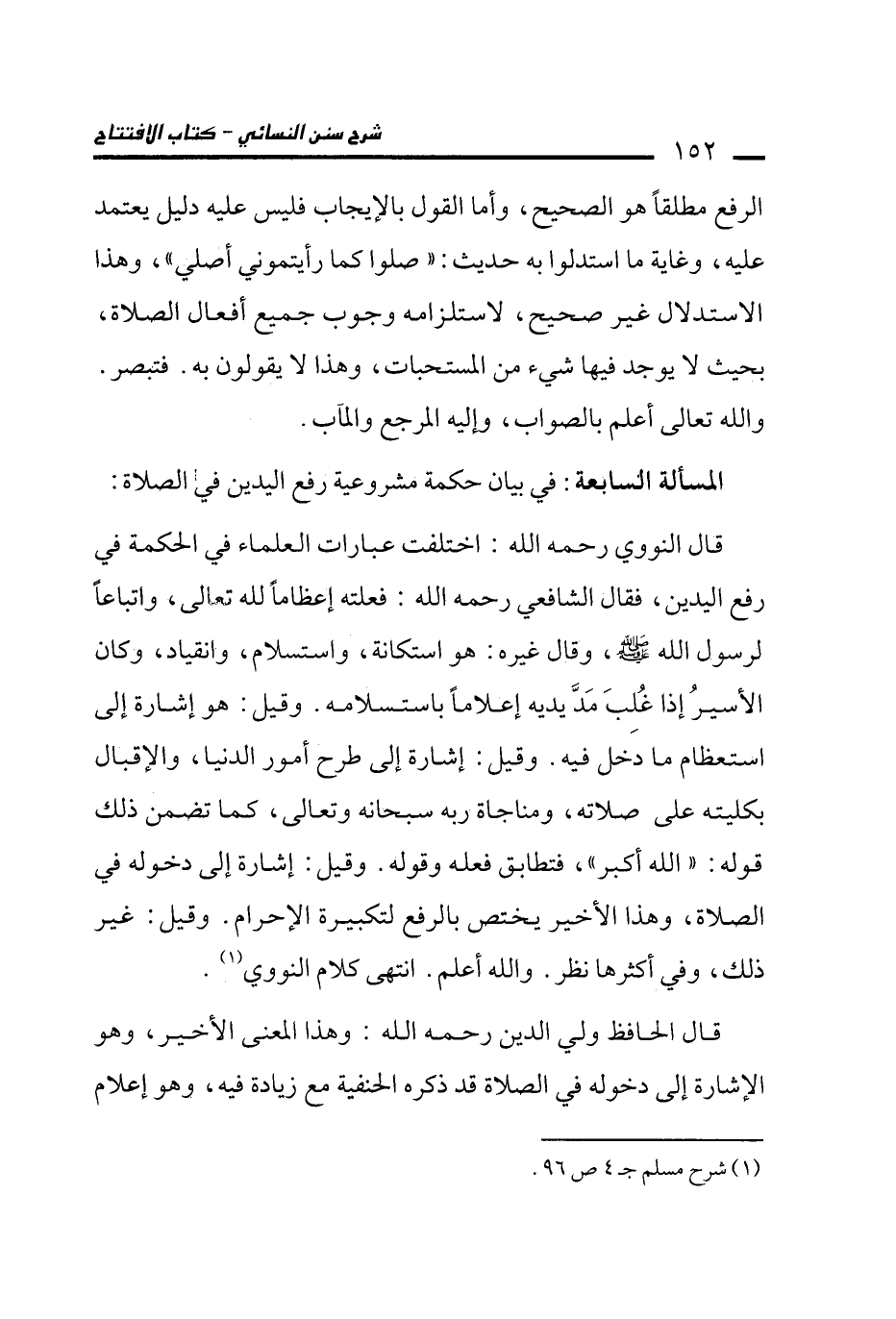 الرفع مطلقاً هو الصحيح، وأما القول بالإيجاب فليس عليه دليل يعتمد عليه، وغاية ما استدلوا به حديث: "صلوا كما رأيتموني أصلي"، وهذا الاستدلال غير صحيح، لاستلزامه وجوب جميع أفعال الصلاة، بحيث لا يوجد فيها شيء من المستحبات، وهذا لا يقولون به. فتبصر. والله تعالى أعلم بالصواب، وإليه المرجع والمآب.