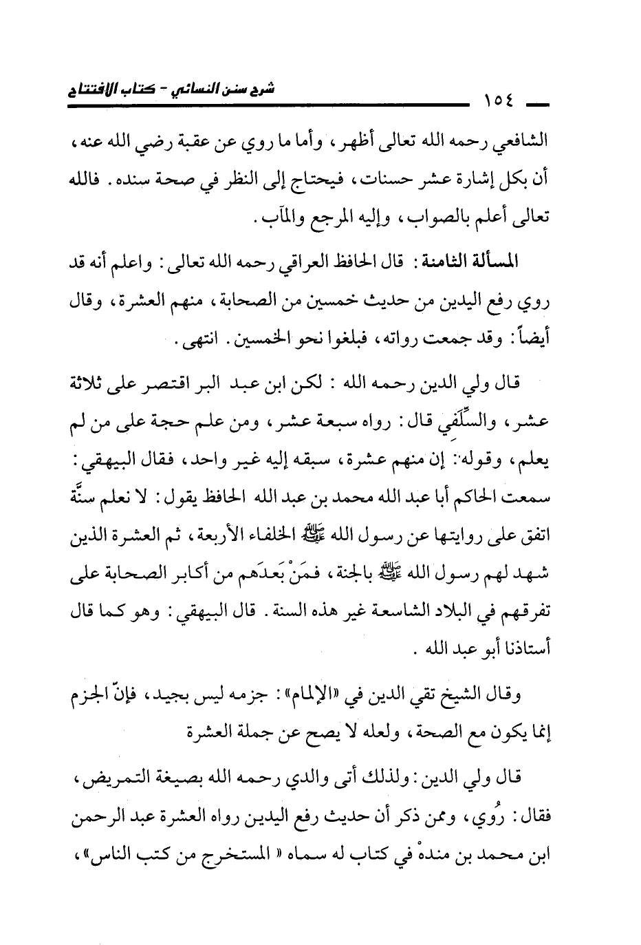 المسألة الثامنة: قال الحافظ العراقي رحمه الله تعالى: واعلم أنه قد روي رفع اليدين من حديث خمسين من الصحابة، منهم العشرة، وقال أيضاً: وقد جمعت رواته، فبلغوا نحو الخمسين. انتهى.