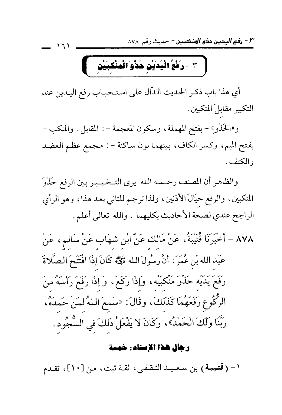 878 - أَخْبَرَنَا قُتَيْبَةُ، عَنْ مَالِكٍ عَنِ ابْنِ شِهَابٍ عَنْ سَالِمٍ، عَنْ عَبْدِ اللَّهِ بْنِ عُمَرَ: أَنَّ رَسُولَ اللَّهِ -صلى الله عليه وسلم- كَانَ إِذَا افْتَتَحَ الصَّلاَةَ رَفَعَ يَدَيْهِ حَذْوَ مَنْكِبَيْهِ، وَإِذَا رَكَعَ، وَإِذَا رَفَعَ رَأْسَهُ مِنَ الرُّكُوعِ رَفَعَهُمَا كَذَلِكَ، وَقَالَ: "سَمِعَ اللَّهُ لِمَنْ حَمِدَهُ، رَبَّنَا وَلَكَ الْحَمْدُ"، وَكَانَ لاَ يَفْعَلُ ذَلِكَ فِي السُّجُودِ.
