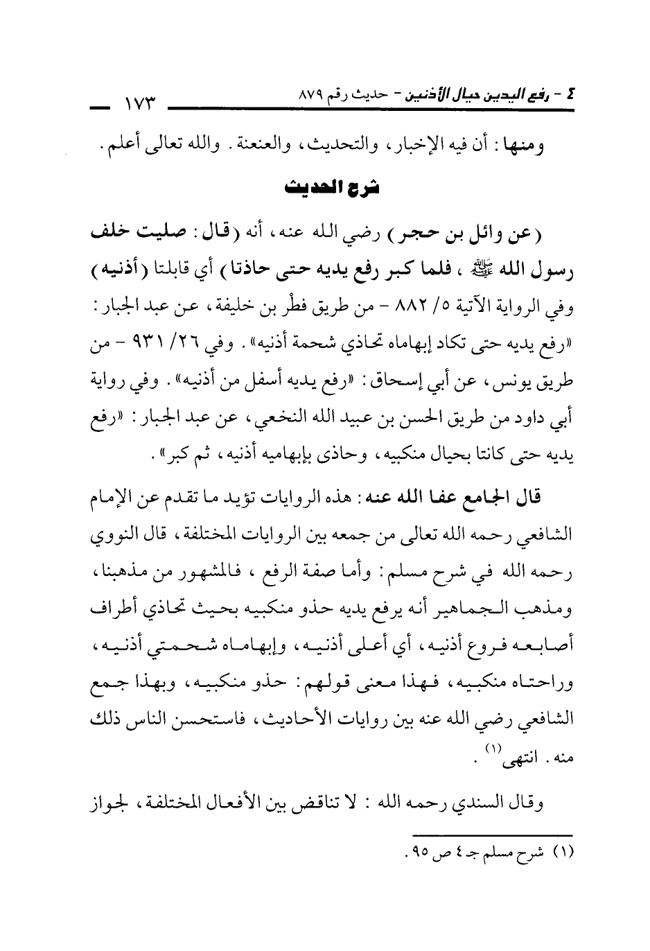 قال الجامع عفا الله عنه: هذه الروايات تؤيد ما تقدم عن الإمام الشافعي رحمه الله تعالى من جمعه بين الروايات المختلفة، قال الثووي رحمه الله في شرح مسلم: وأما صفة الرفع، فالمشهور من مذهبنا، ومذهب الجماهير أنه يرفع يديه حذو منكبيه بحيث تحاذي أطراف أصابعه فروع أذنيه، أي أعلى أذنيه، وإبهاماه شحمتي أذنيه، وراحتاه منكبيه، فهذا معنى قولهم: حذو منكبيه، وبهذا جمع الشافعي رضي الله عنه بين روايات الأحاديث، فاستحسن الناس ذلك منه. انتهى. (¬1)
