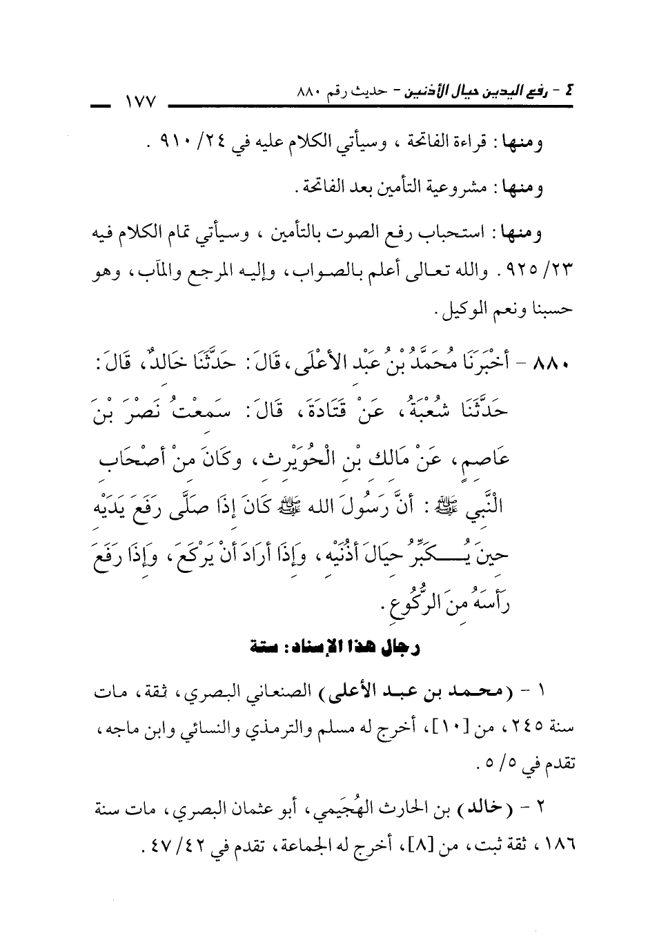 880 - أَخْبَرَنَا مُحَمَّدُ بْنُ عَبْدِ الأَعْلَى، قَالَ: حَدَّثَنَا خَالِدٌ، قَالَ: حَدَّثَنَا شُعْبَةُ، عَنْ قَتَادَةَ، قَالَ: سَمِعْتُ نَصْرَ بْنَ عَاصِمٍ، عَنْ مَالِكِ بْنِ الْحُوَيْرِثِ، وَكَانَ مِنْ أَصْحَابِ النَّبِيِّ -صلى الله عليه وسلم-: أَنَّ رَسُولَ اللَّهِ -صلى الله عليه وسلم- كَانَ إِذَا صَلَّى رَفَعَ يَدَيْهِ حِينَ يُكَبِّرُ حِيَالَ أُذُنَيْهِ، وَإِذَا أَرَادَ أَنْ يَرْكَعَ، وَإِذَا رَفَعَ رَأْسَهُ مِنَ الرُّكُوعِ.