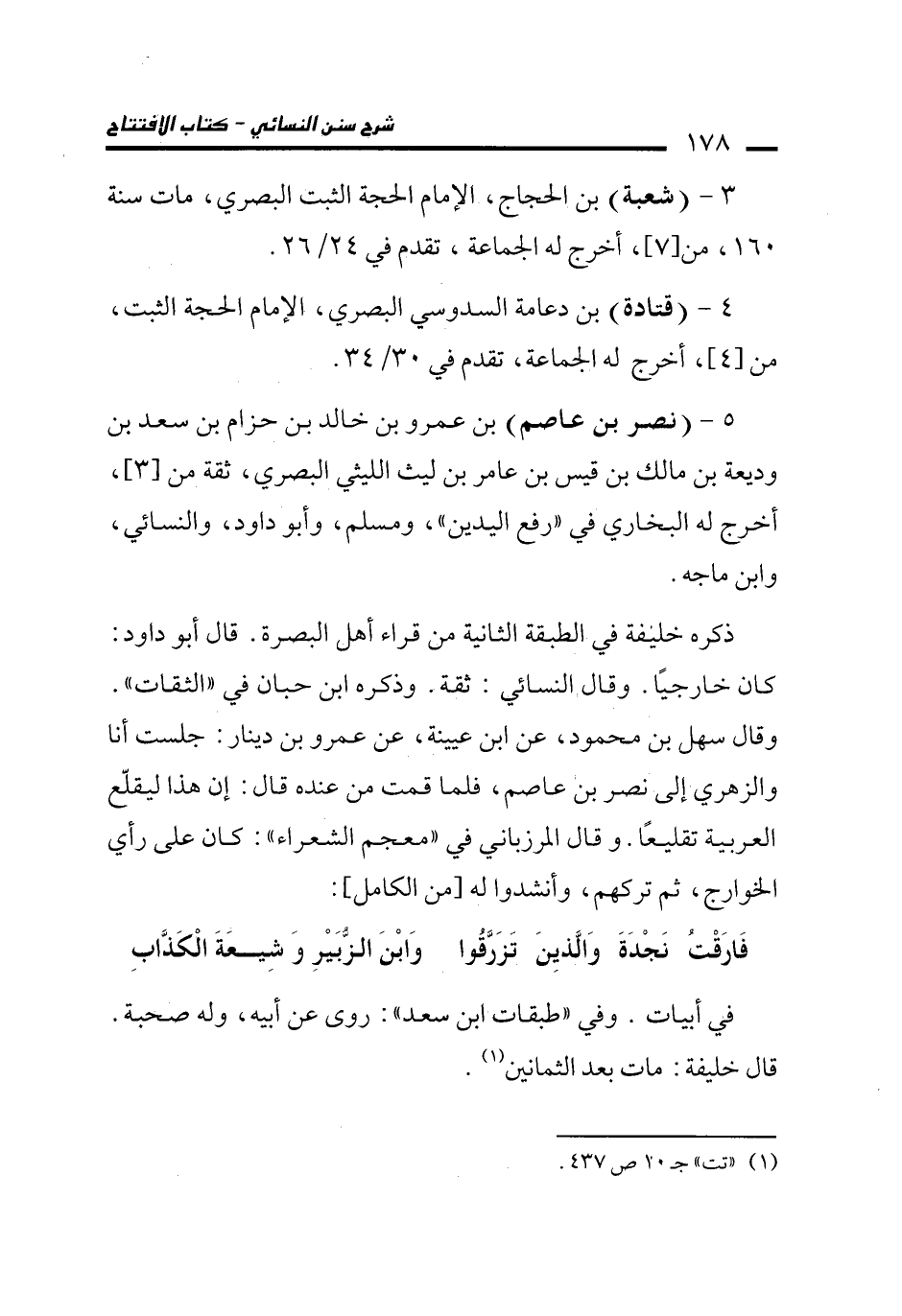 5 - (نصر بن عاصم) بن عمرو بن خالد بن حزام بن سعد بن وديعة بن مالك بن قيس بن عامر بن ليث الليثي البصري، ثقة من [3]، أخرج له البخاري في "رفع اليدين"، ومسلم، وأبو داود، والنسائي، وابن ماجه.