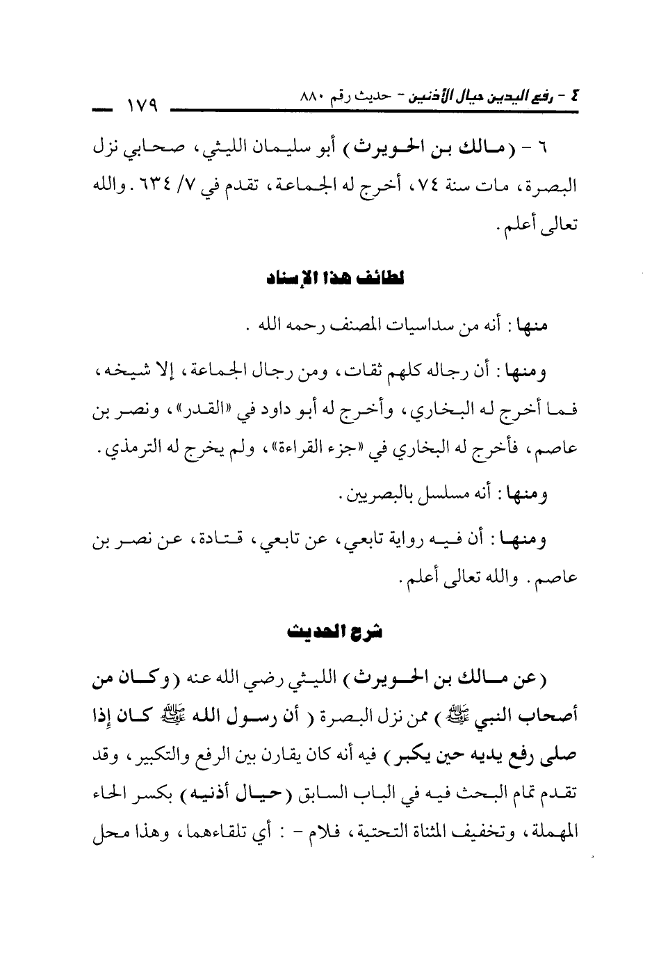 (عن مالك بن الحويرث) الليثي رضي الله عنه (وكان من أصحاب النبي -صلى الله عليه وسلم-) ممن نزل البصرة (أن رسول الله -صلى الله عليه وسلم- كان إِذا صلى رفع يديه حين يكبر) فيه أنه كان يقارن بين الرفع والتكبير، وقد تقدم تمام البحث فيه في الباب السابق (حيال أذنيه) بكسر الحاء المهملة، وتخفيف المثناة التحتية، فلام-: أي تلقاءهما، وهذا محل