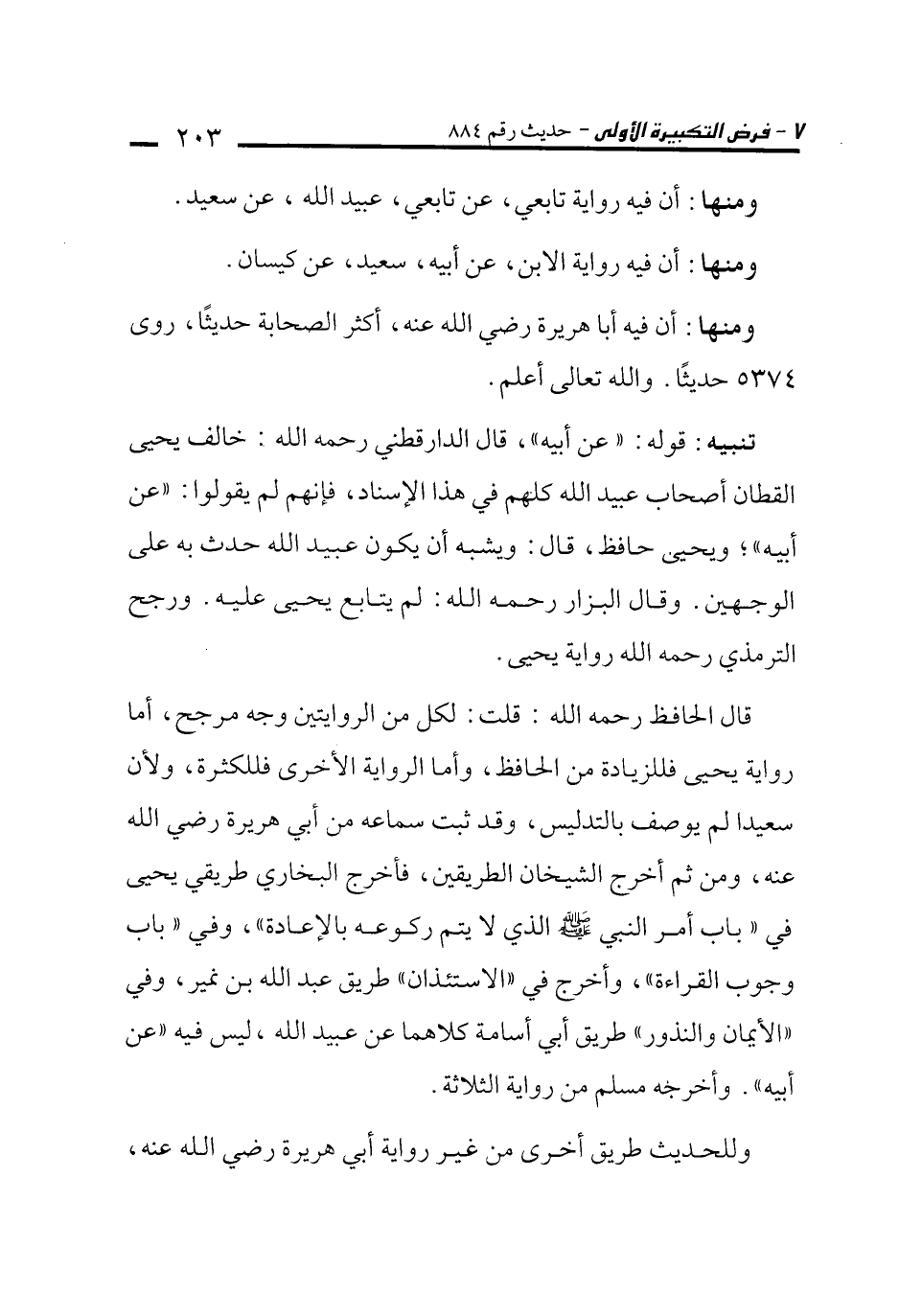 قال الحافظ رحمه الله: قلت: لكل من الروايتين وجه مرجح، أما رواية يحيى فللزيادة من الحافظ، وأما الرواية الأخرى فللكثرة، ولأن سعيدا لم يوصف بالتدليس، وقد ثبت سماعه من أبي هريرة رضي الله عنه، ومن ثم أخرج الشيخان الطريقين، فأخرج البخاري طريقي يحيى في "باب أمر النبي -صلى الله عليه وسلم- الذي لا يتم ركوعه بالإعادة"، وفي "باب وجوب القراءة"، وأخرج في "الاستئذان" طريق عبد الله بن نمير، وفي "الأيمان والنذور" طريق أبي أسامة كلاهما عن عبيد الله، ليس فيه "عن أبيه". وأخرجه مسلم من رواية الثلاثة.