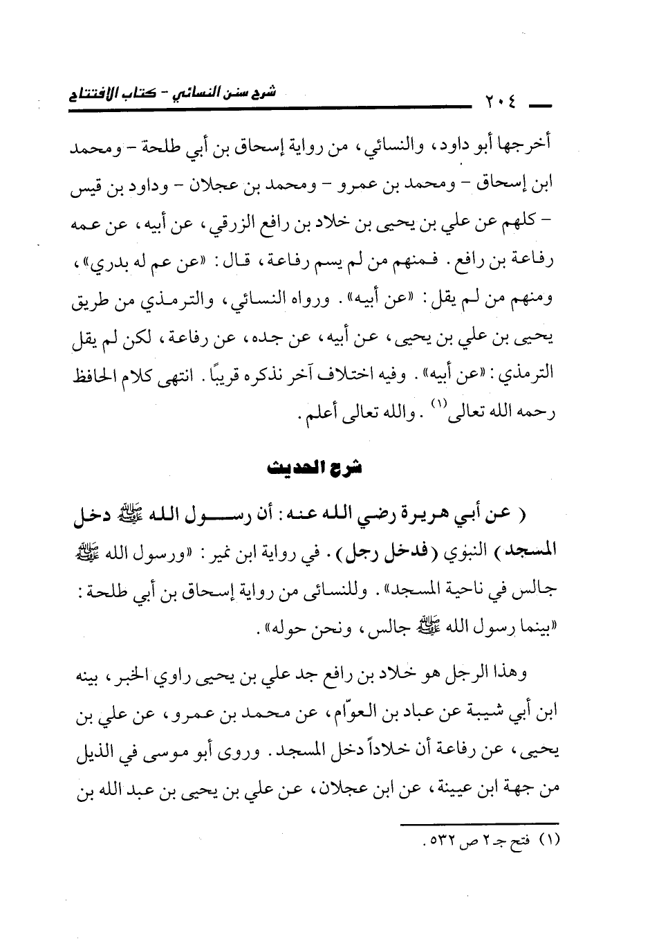 (عن أبي هريرة رضي الله عنه: أن رسول الله -صلى الله عليه وسلم- دخل المسجد) النبوي (فدخل رجل). في رواية ابن نمير: "ورسول الله -صلى الله عليه وسلم- جالس في ناحية المسجد". وللنسائى من رواية إسحاق بن أبي طلحة: "بينما رسول الله -صلى الله عليه وسلم- جالس، ونحن حوله".