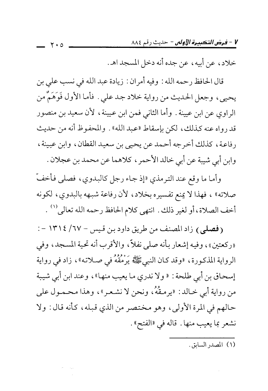 قال الحافظ رحمه الله: وفيه أمران: زيادة عبد الله في نسب علي بن يحيى، وجعل الحديث من رواية خلاد جد علي. فأما الأول فَوَهَمٌ من الراوي عن ابن عيينة. وأما الثاني فمن ابن عيينة، لأن سعيد بن منصور قد رواه عنه كذلك، لكن بإسقاط "عبد الله". والمحفوظ أنه من حديث رفاعة، كذلك أخرجه أحمد عن يحيى بن سعيد القطان، وابن عيينة، وابن أبي شيبة عن أبي خالد الأحمر، كلاهما عن محمد بن عجلان.