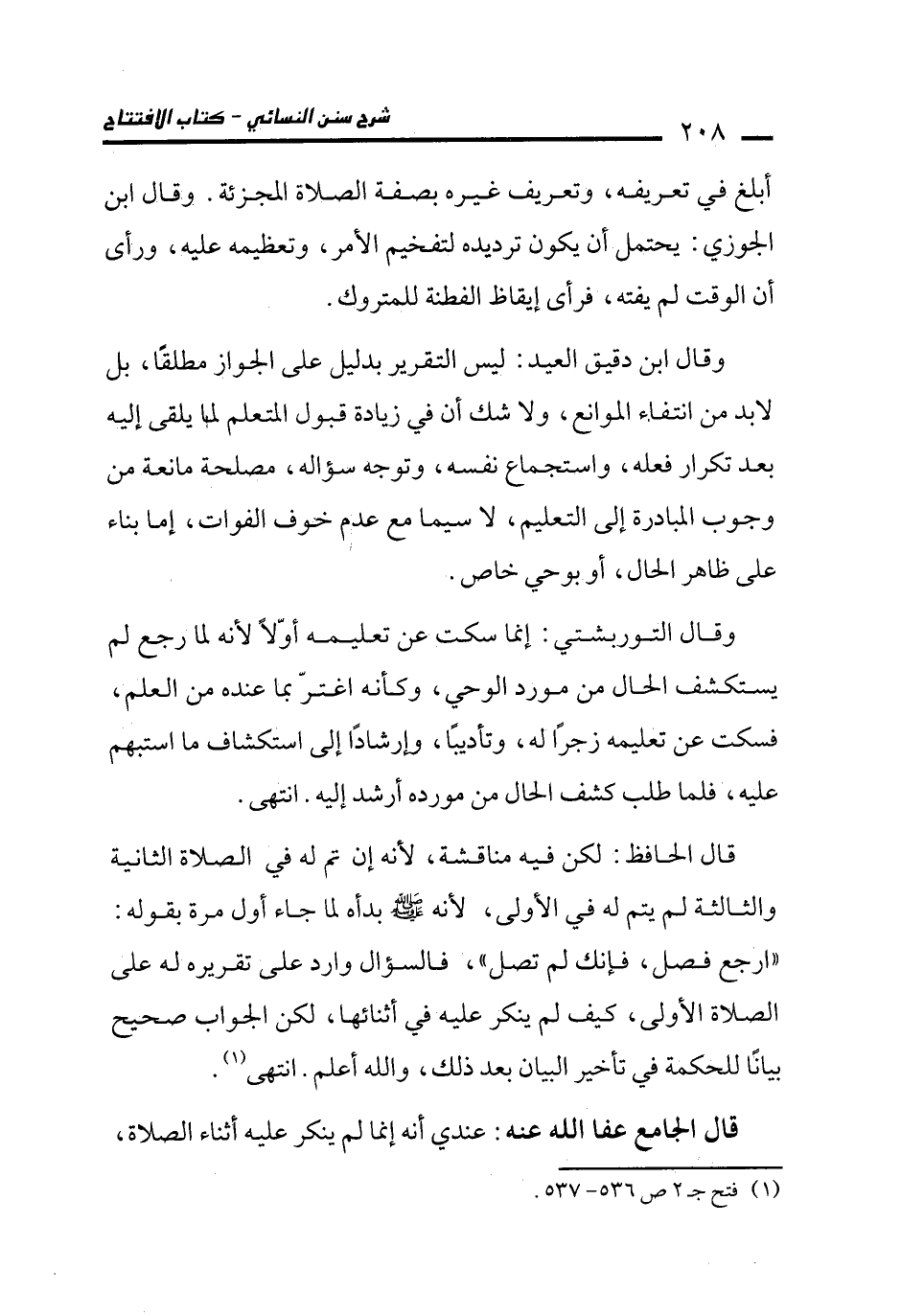 قال الحافظ: لكن فيه مناقشة، لأنه إن تم له في الصلاة الثانية والثالثة لم يتم له في الأولى، لأنه -صلى الله عليه وسلم- بدأه لما جاء أول مرة بقوله: "ارجع فصل، فإنك لم تصل"، فالسؤال وارد على تقريره له على الصلاة الأولى، كيف لم ينكر عليه في أثنائها، لكن الجواب صحيح بيانًا للحكمة في تأخير البيان بعد ذلك، والله أعلم. انتهى (¬1).