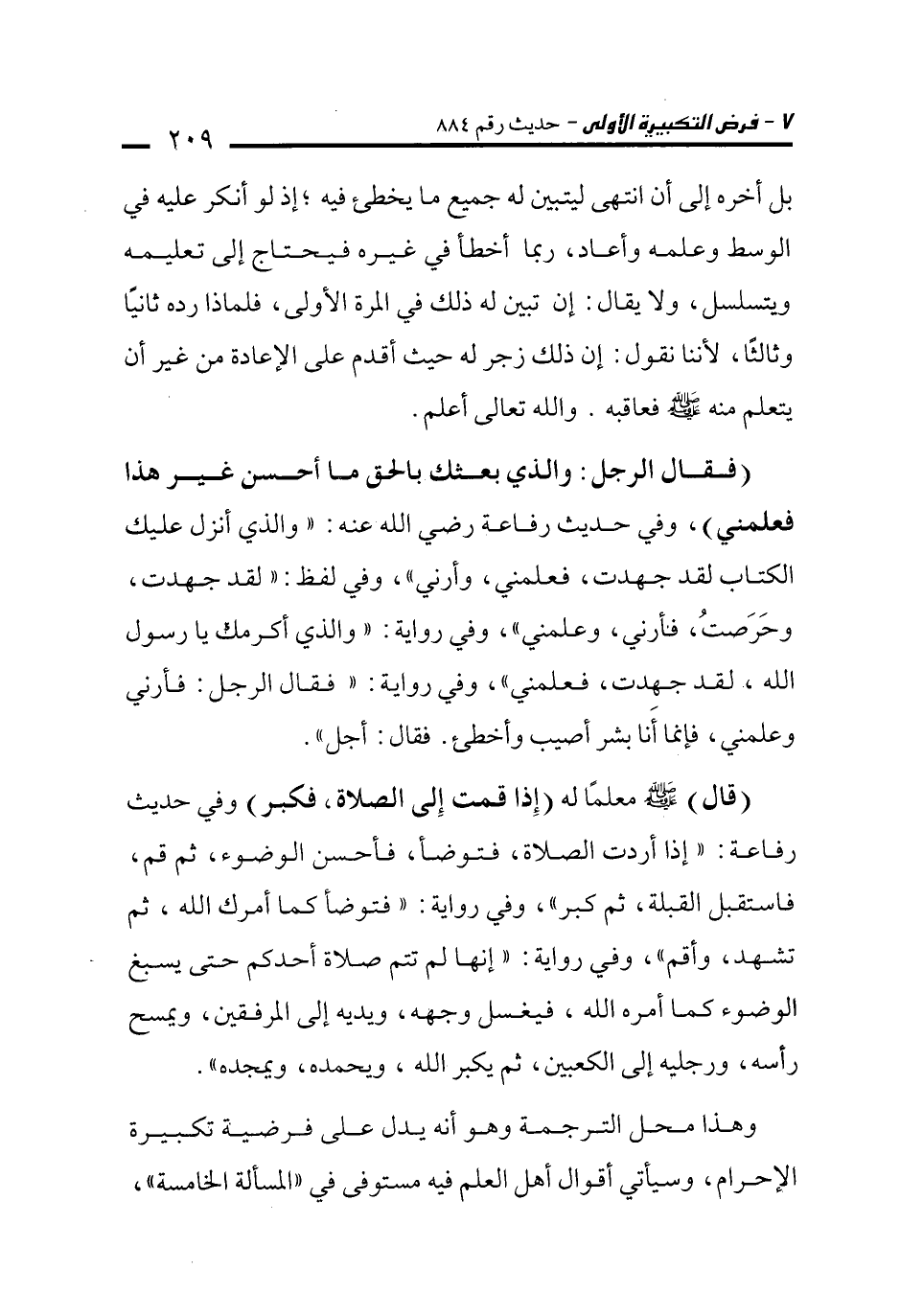 (فقال الرجل: والذي بعثك بالحق ما أحسن غير هذا فعلمني)، وفي حديث رفاعة رضي الله عنه: "والذي أنزل عليك الكتاب لقد جهدت، فعلمني، وأرني"، وفي لفظ: "لقد جهدت، وحَرَصتُ، فأرني، وعلمني"، وفي رواية: "والذي أكرمك يا رسول الله، لقد جهدت، فعلمني"، وفي رواية: "فقال الرجل: فأرني وعلمني، فإنما أَنا بشر أصيب وأخطىء. فقال: أجل".