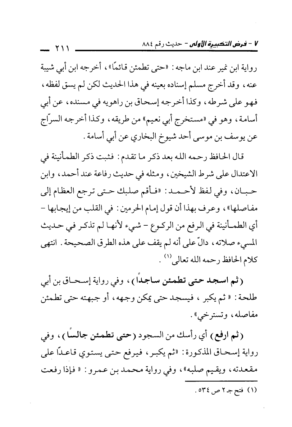 قال الحافظ رحمه الله بعد ذكر ما تقدم: فثبت ذكر الطمأنينة في الاعتدال على شرط الشيخين، ومثله في حديث رفاعة عند أحمد، وابن حبان، وفي لفظ لأحمد: "فأقم صلبك حتى ترجع العظام إلى مفاصلها"، وعرف بهذا أن قول إمام الحرمين: في القلب من إيجابها -أي الطمأنينة في الرفع من الركوع- شيء لأنها لم تذكر في حديث المسيء صلاته، دالّ على أنه لم يقف على هذه الطرق الصحيحة. انتهى كلام الحافظ رحمه الله تعالى (¬1).