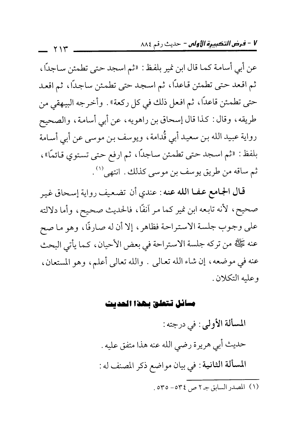 قال الجامع عفا الله عنه: عندي أن تضعيف رواية إسحاق غير صحيح، لأنه تابعه ابن نمير كما مر آنفًا، فالحديث صحيح، وأما دلالته على وجوب جلسة الاستراحة فظاهر، إلا أن له صارفًا، وهو ما صح عنه -صلى الله عليه وسلم- من تركه جلسة الاستراحة في بعض الأحيان، كما يأتي البحث عنه في موضعه، إن شاء الله تعالى. والله تعالى أعلم، وهو المستعان، وعليه التكلان.