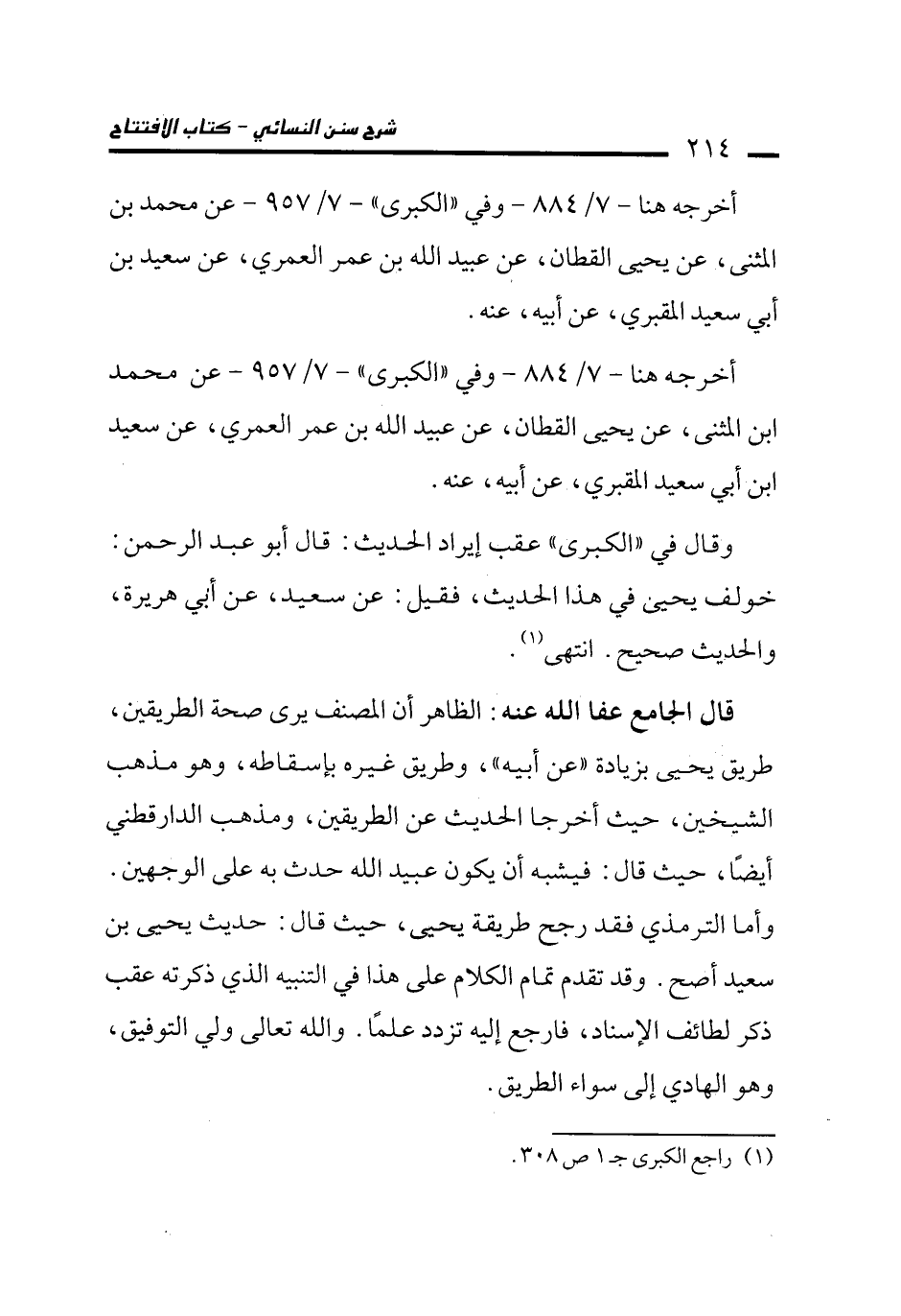 قال الجامع عفا الله عنه: الظاهر أن المصنف يرى صحة الطريقين، طريق يحيى بزيادة "عن أبيه"، وطريق غيره بإسقاطه، وهو مذهب الشيخين، حيث أخرجا الحديث عن الطريقين، ومذهب الدارقطني أيضًا، حيث قال: فيشبه أن يكون عبيد الله حدث به على الوجهين. وأما الترمذي فقد رجح طريقة يحيى، حيث قال: حديث يحيى بن سعيد أصح. وقد تقدم تمام الكلام على هذا في التنبيه الذي ذكرته عقب ذكر لطائف الإسناد، فارجع إليه تزدد علمًا. والله تعالى ولي التوفيق، وهو الهادي إلى سواء الطريق.