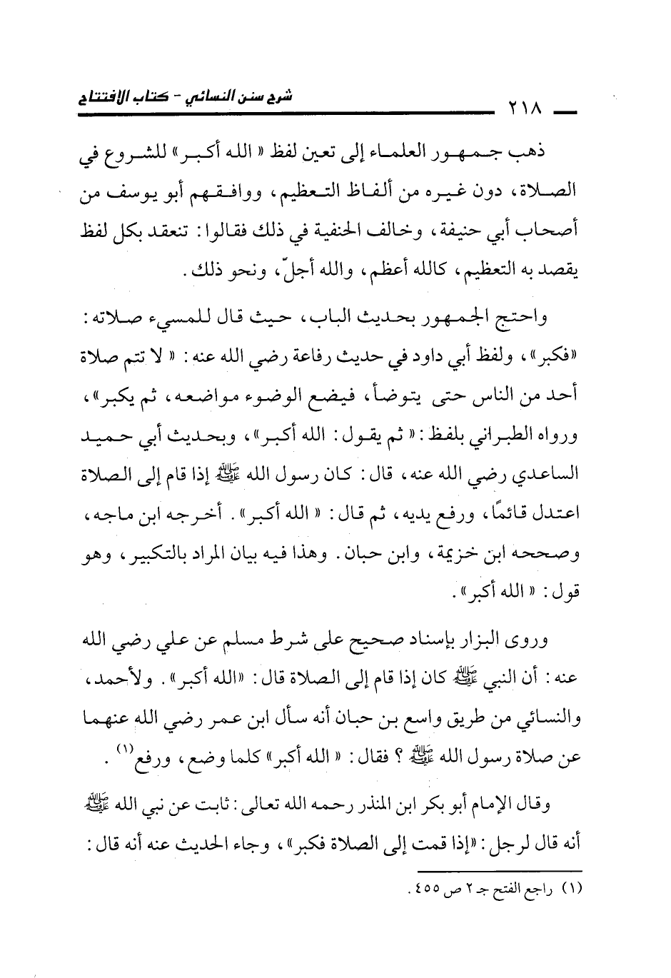 واحتج الجمهور بحديث الباب، حيث قال للمسيء صلاته: "فكبر"، ولفظ أبي داود في حديث رفاعة رضي الله عنه: "لا تتم صلاة أحد من الناس حتى يتوضأ، فيضع الوضوء مواضعه، ثم يكبر"، ورواه الطبراني بلفظ: "ثم يقول: الله أكبر"، وبحديث أبي حميد الساعدي رضي الله عنه، قال: كان رسول الله -صلى الله عليه وسلم- إذا قام إلى الصلاة اعتدل قائمًا، ورفع يديه، ثم قال: "الله أكبر". أخرجه ابن ماجه، وصححه ابن خزيمة، وابن حبان. وهذا فيه بيان المراد بالتكبير، وهو قول: "الله أكبر".
