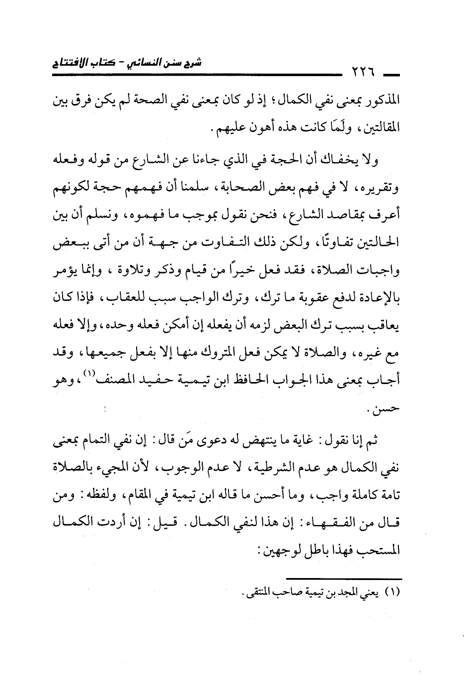 ثم إنا نقول: غاية ما ينتهض له دعوى مَن قال: إن نفي التمام بمعنى نفي الكمال هو عدم الشرطية، لا عدم الوجوب، لأن المجيء بالصلاة تامة كاملة واجب، وما أحسن ما قاله ابن تيمية في المقام، ولفظه: ومن قال من الفقهاء: إن هذا لنفي الكمال. قيل: إن أردت الكمال المستحب فهذا باطل لوجهين: