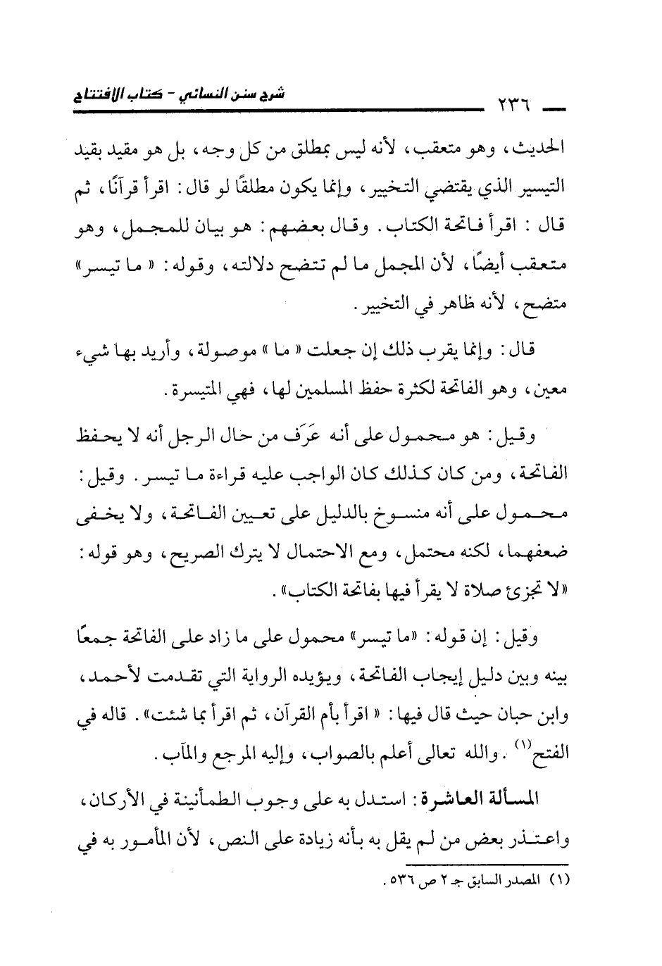 الحديث، وهو متعقب، لأنه ليس بمطلق من كل وجه، بل هو مقيد بقيد التيسير الذي يقتضي التخيير، وإنما يكون مطلقًا لو قال: اقرأ قرآنًا، ثم قال: اقرأ فاتحة الكتاب. وقال بعضهم: هو بيان للمجمل، وهو متعقب أيضًا، لأن المجمل ما لم تتضح دلالته، وقوله: "ما تيسر" متضح، لأنه ظاهر في التخيير.