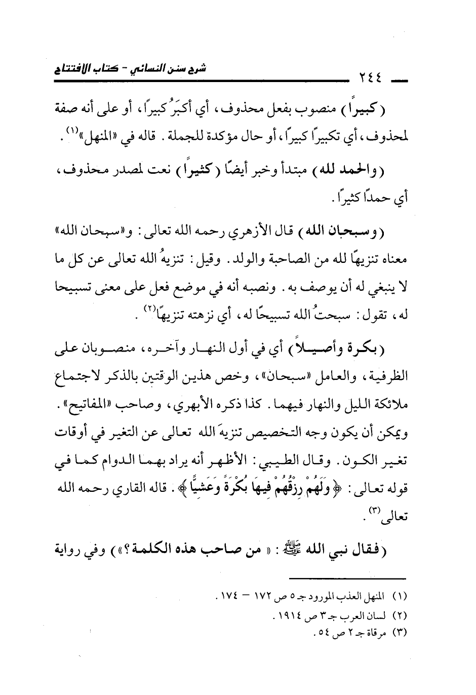 (بكرة وأصيلاً) أي في أول النهار وآخره، منصوبان على الظرفية، والعامل "سبحان"، وخص هذين الوقتين بالذكر لاجتماع ملائكة الليل والنهار فيهما. كذا ذكره الأبهري، وصاحب "المفاتيح". ويمكن أن يكون وجه التخصيص تنزيهَ الله تعالى عن التغير في أوقات تغير الكون. وقال الطيبي: الأظهر أنه يراد بهما الدوام كما في قوله تعالى: {وَلَهُمْ رِزْقُهُمْ فِيهَا بُكْرَةً وَعَشِيًّا}. قاله القاري رحمه الله تعالى (¬3).