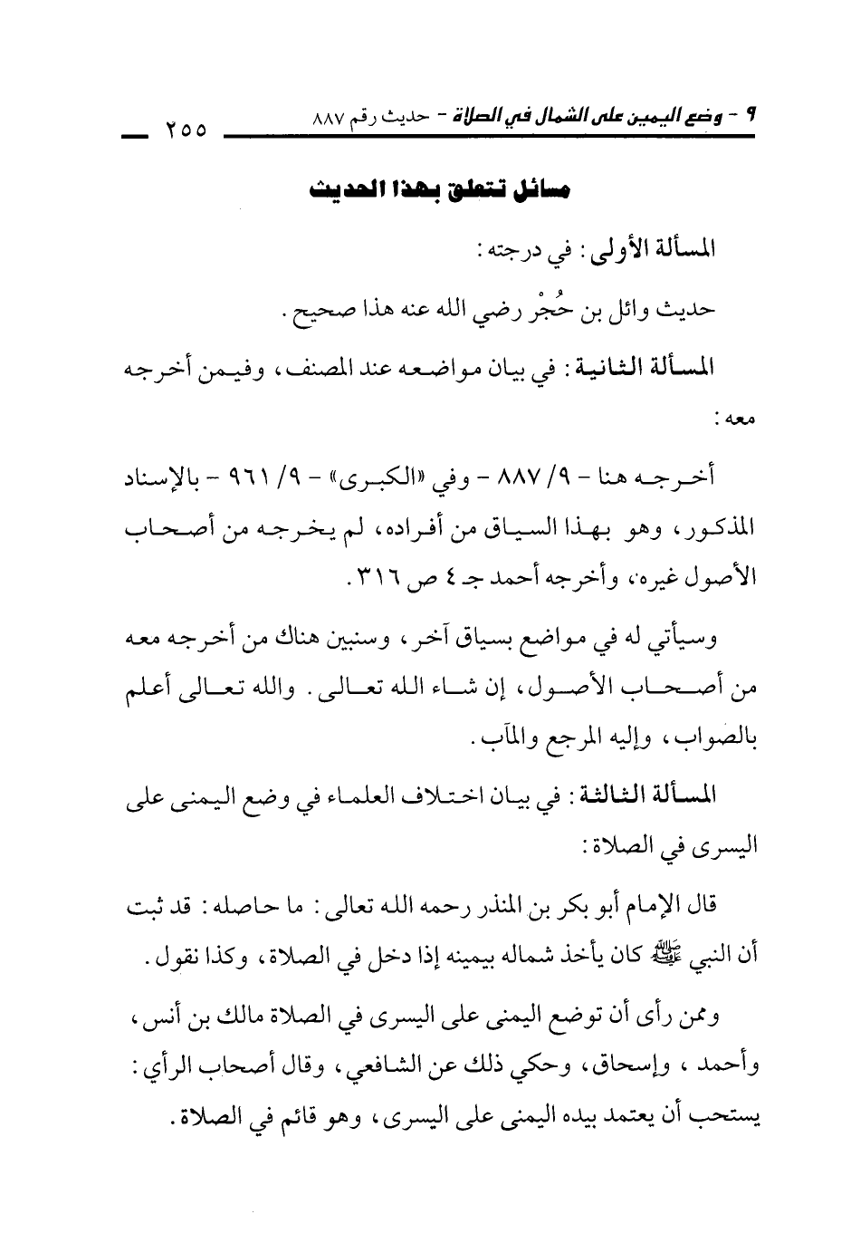 المسألة الثانية: في بيان اختلاف العلماء في وضع اليمنى على اليسرى في الصلاة: