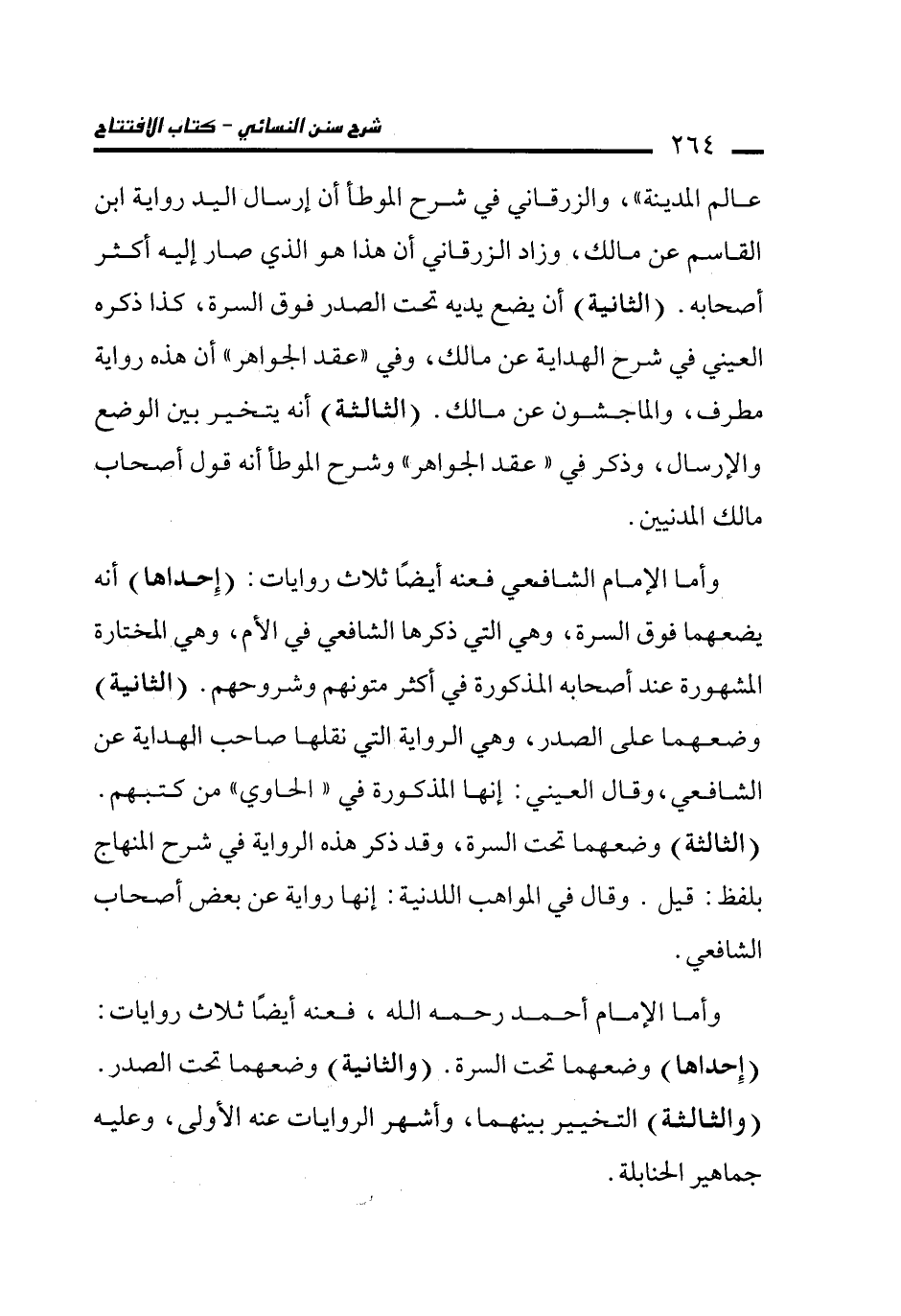 وأما الإمام أحمد رحمه الله، فعنه أيضًا ثلاث روايات: (إِحداها) وضعهما تحت السرة. (والثانية) وضعهما تحت الصدر. (والثالثة) التخيير بينهما، وأشهر الروايات عنه الأولى، وعليه جماهير الحنابلة.