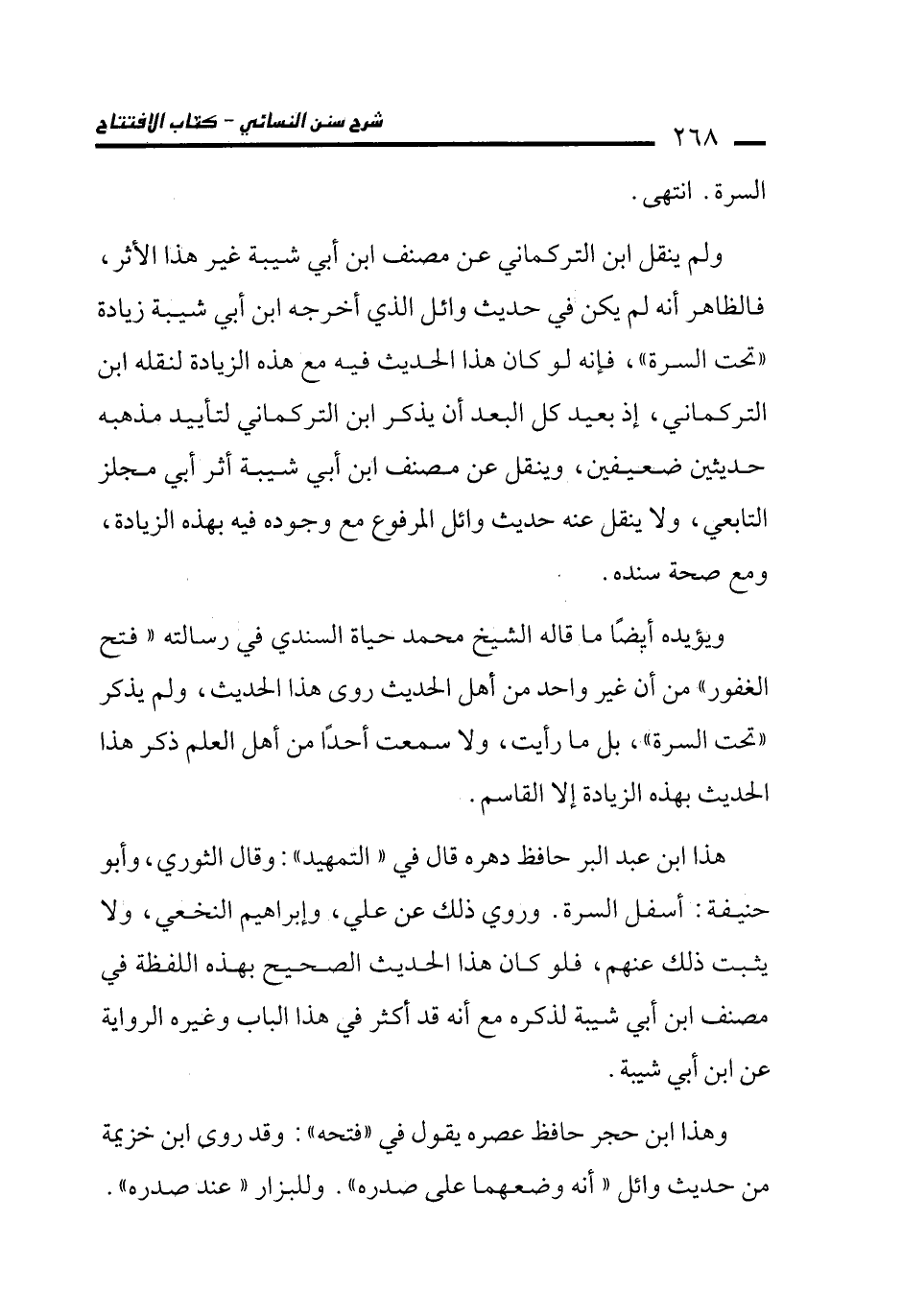 ولم ينقل ابن التركماني عن مصنف ابن أبي شيبة غير هذا الأثر، فالظاهر أنه لم يكن في حديث وائل الذي أخرجه ابن أبي شيبة زيادة "تحت السرة"، فإنه لو كان هذا الحديث فيه مع هذه الزيادة لنقله ابن التركماني، إذ بعيد كل البعد أن يذكر ابن التركماني لتأييد مذهبه حديثين ضعيفين، وينقل عن مصنف ابن أبي شيبة أثر أبي مجلز التابعي، ولا ينقل عنه حديث وائل المرفوع مع وجوده فيه بهذه الزيادة، ومع صحة سنده.