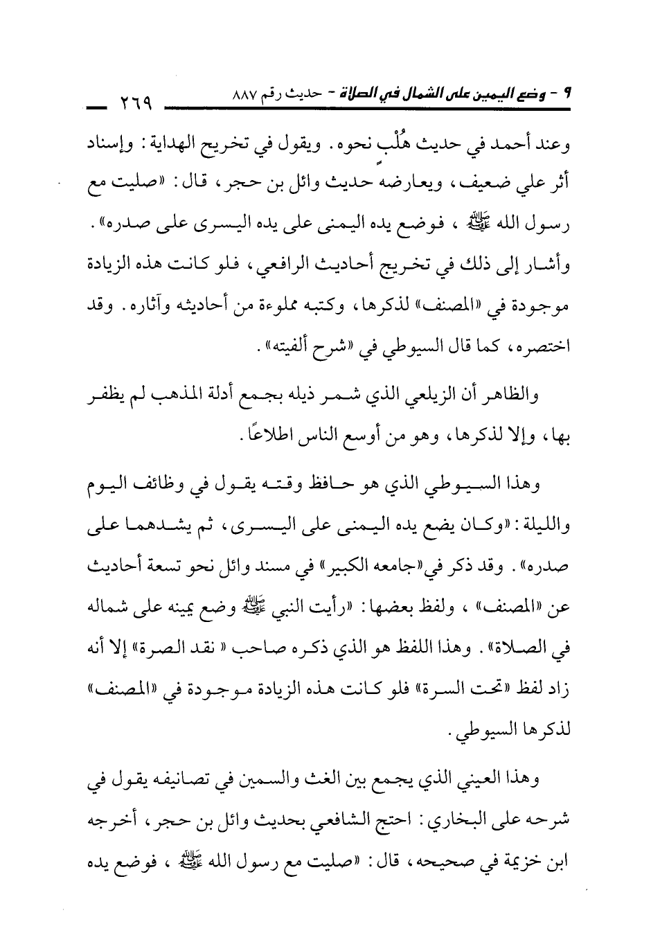 وهذا السيوطي الذي هو حافظ وقته يقول في وظائف اليوم والليلة: "وكان يضع يده اليمنى على اليسرى، ثم يشدهما على صدره". وقد ذكر في "جامعه الكبير" في مسند وائل نحو تسعة أحاديث عن "المصنف"، ولفظ بعضها: "رأيت النبي -صلى الله عليه وسلم- وضع يمينه على شماله في الصلاة". وهذا اللفظ هو الذي ذكره صاحب "نقد الصرة" إلا أنه زاد لفظ "تحت السرة" فلو كانت هذه الزيادة موجودة في "المصنف" لذكرها السيوطي.