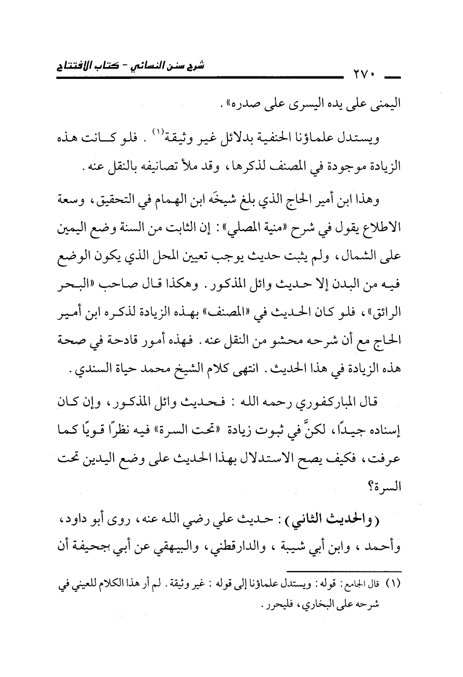وهذا ابن أمير الحاج الذي بلغ شيخَه ابن الهمام في التحقيق، وسعة الاطلاع يقول في شرح "منية المصلي": إن الثابت من السنة وضع اليمين على الشمال، ولم يثبت حديث يوجب تعيين المحل الذي يكون الوضع فيه من البدن إلا حديث وائل المذكور. وهكذا قال صاحب "البحر الرائق"، فلو كان الحديث في "المصنف" بهذه الزيادة لذكره ابن أمير الحاج مع أن شرحه محشو من النقل عنه. فهذه أمور قادحة في صحة هذه الزيادة في هذا الحديث. انتهى كلام الشيخ محمد حياة السندي.