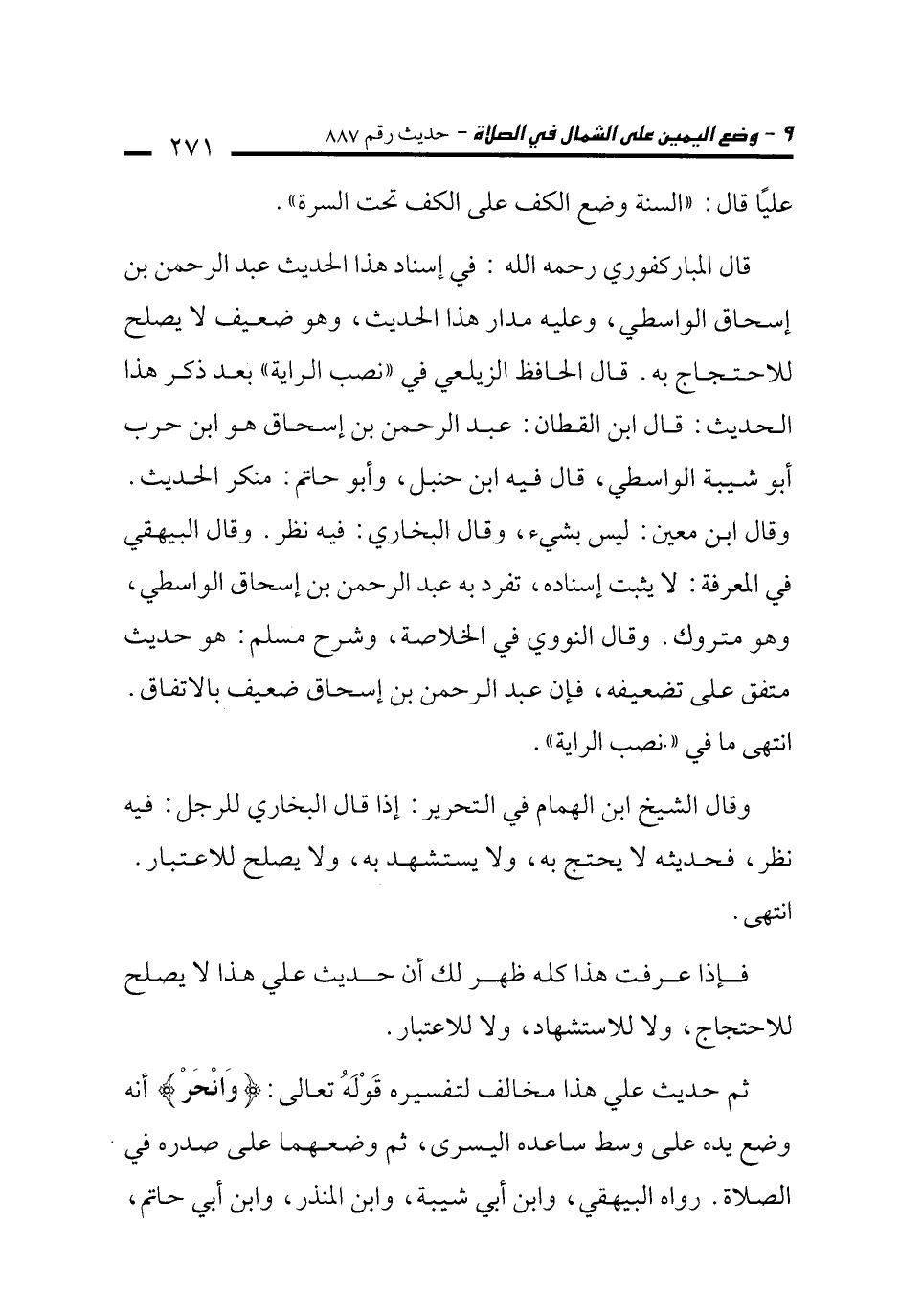 ثم حديث علي هذا مخالف لتفسيره قَوْلَهُ تعالى: {وَانْحَرْ} أنه وضع يده على وسط ساعده اليسرى، ثم وضعهما على صدره في الصلاة. رواه البيهقي، وابن أبي شيبة، وابن المنذر، وابن أبي حاتم،
