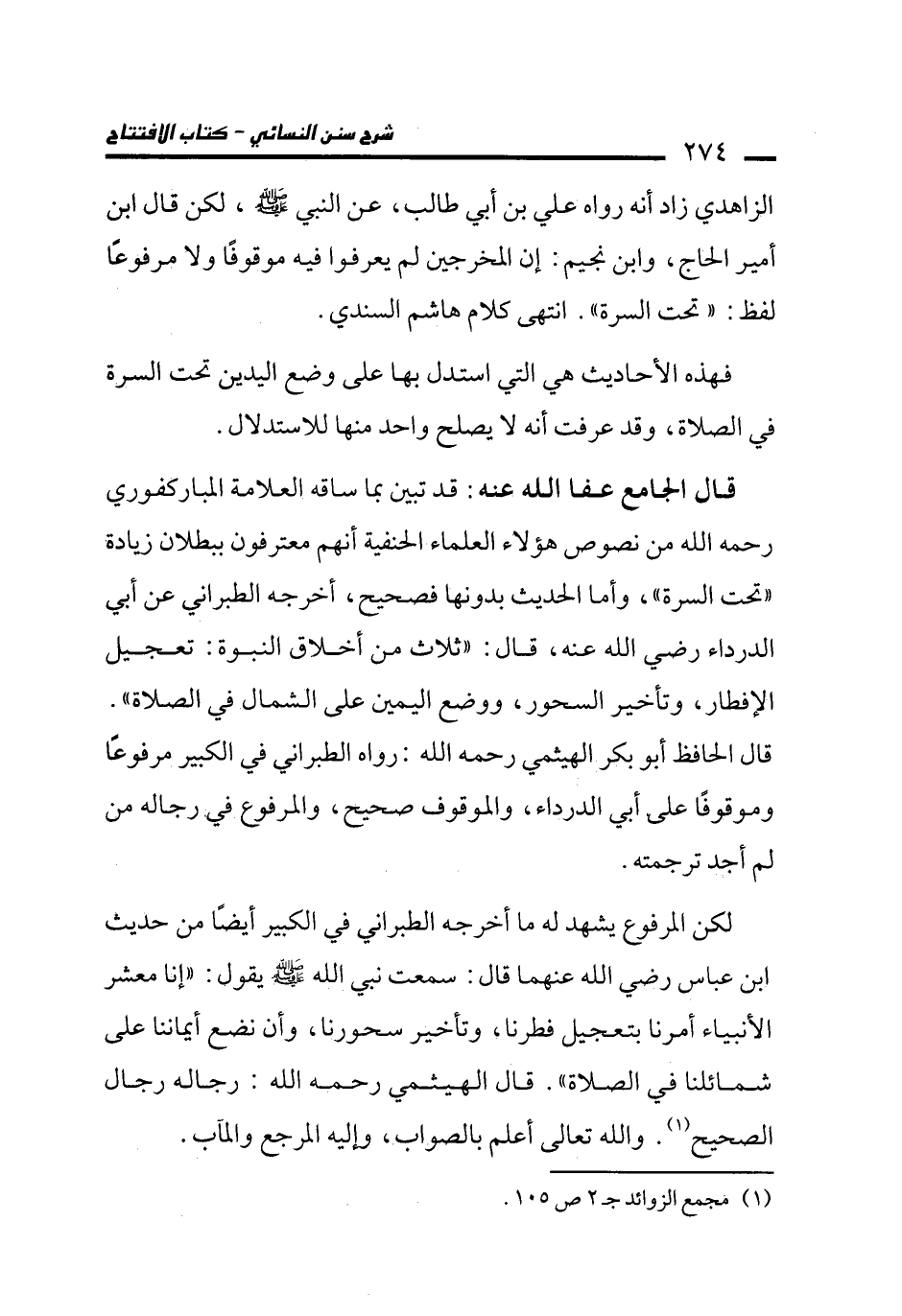 الزاهدي زاد أنه رواه علي بن أبي طالب، عن النبي -صلى الله عليه وسلم-، لكن قال ابن أمير الحاج، وابن نجيم: إن المخرجين لم يعرفوا فيه موقوفًا ولا مرفوعًا لفظ: "تحت السرة". انتهى كلام هاشم السندي.