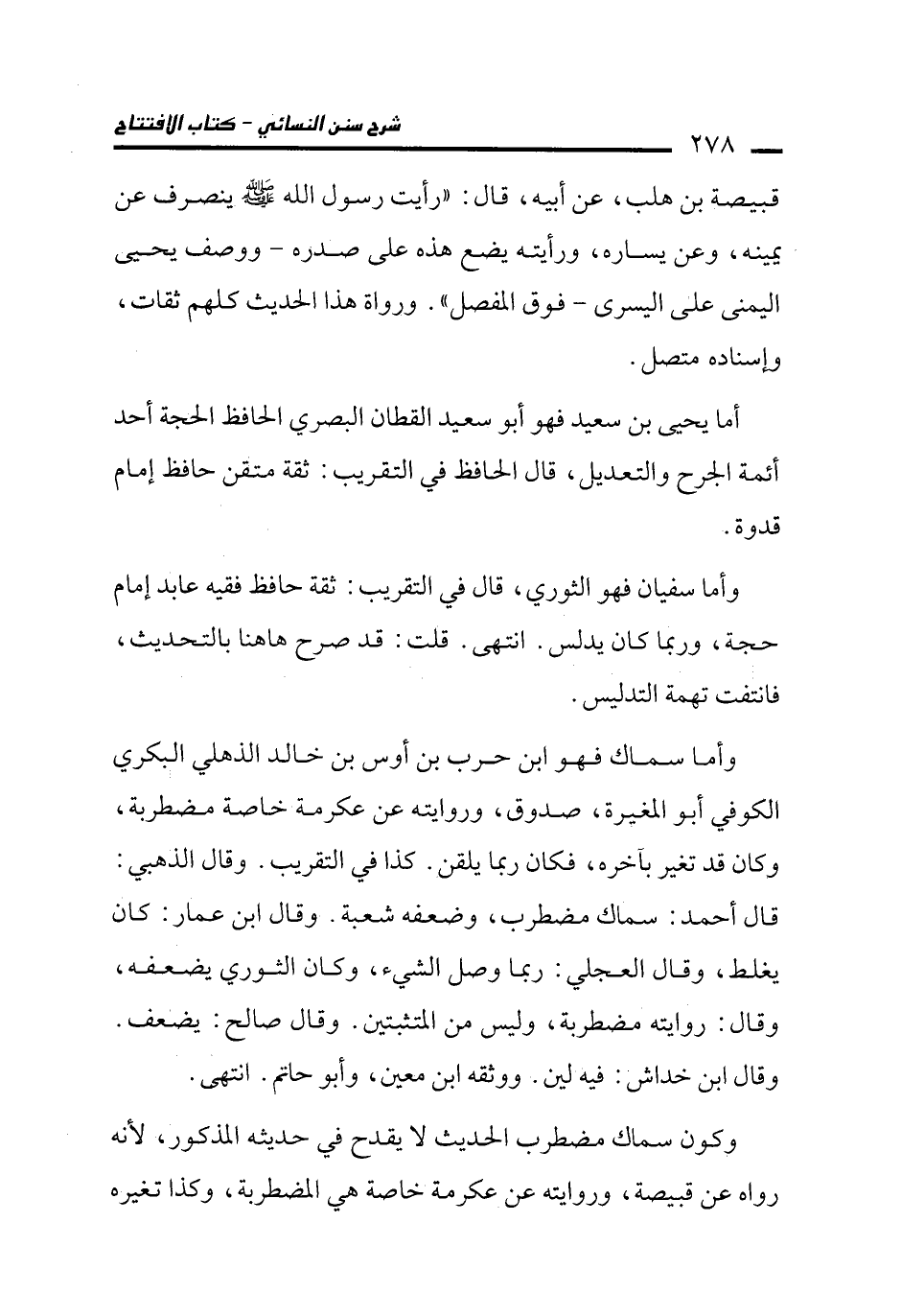 قبيصة بن هلب، عن أبيه، قال: "رأيت رسول الله -صلى الله عليه وسلم- ينصرف عن يمينه، وعن يساره، ورأيته يضع هذه على صدره -ووصف يحيى اليمنى على اليسرى- فوق المفصل". ورواة هذا الحديث كلهم ثقات، وإسناده متصل.