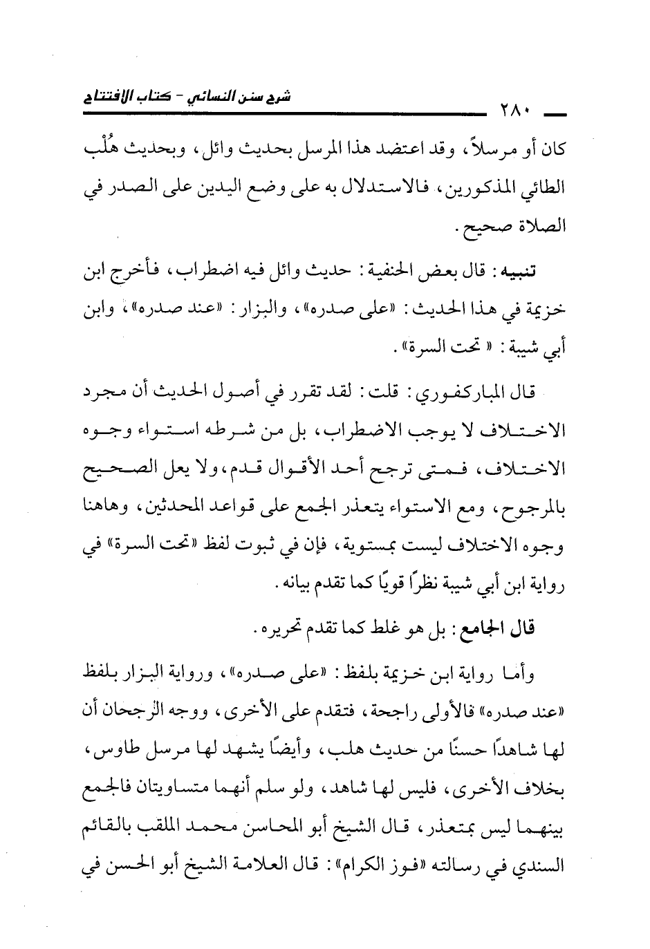 وأما رواية ابن خزيمة بلفظ: "على صدره"، ورواية البزار بلفظ "عند صدره" فالأولى راجحة، فتقدم على الأخرى، ووجه الرجحان أن لها شاهدًا حسنًا من حديث هلب، وأيضاً يشهد لها مرسل طاوس، بخلاف الأخرى، فليس لها شاهد، ولو سلم أنهما متساويتان فالجمع بينهما ليس بمتعذر، قال الشيخ أبو المحاسن محمد الملقب بالقائم السندي في رسالته "فوز الكرام": قال العلامة الشيخ أبو الحسن في