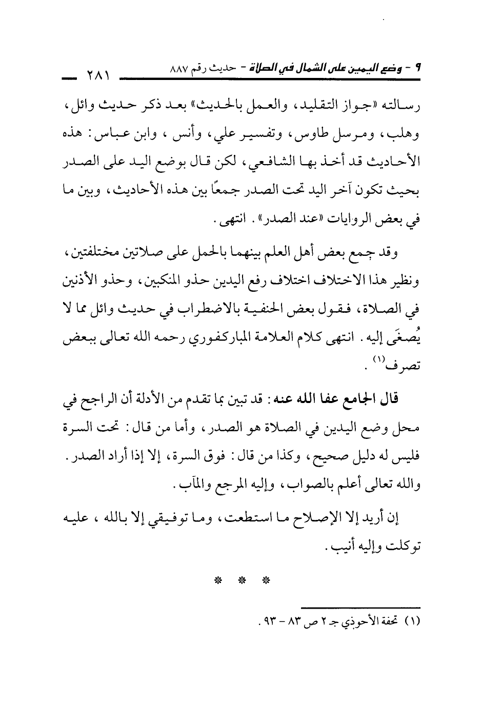 قال الجامع عفا الله عنه: قد تبين بما تقدم من الأدلة أن الراجح في محل وضع اليدين في الصلاة هو الصدر، وأما من قال: تحت السرة فليس له دليل صحيح، وكذا من قال: فوق السرة، إلا إذا أراد الصدر. والله تعالى أعلم بالصواب، وإليه المرجع والمآب.
