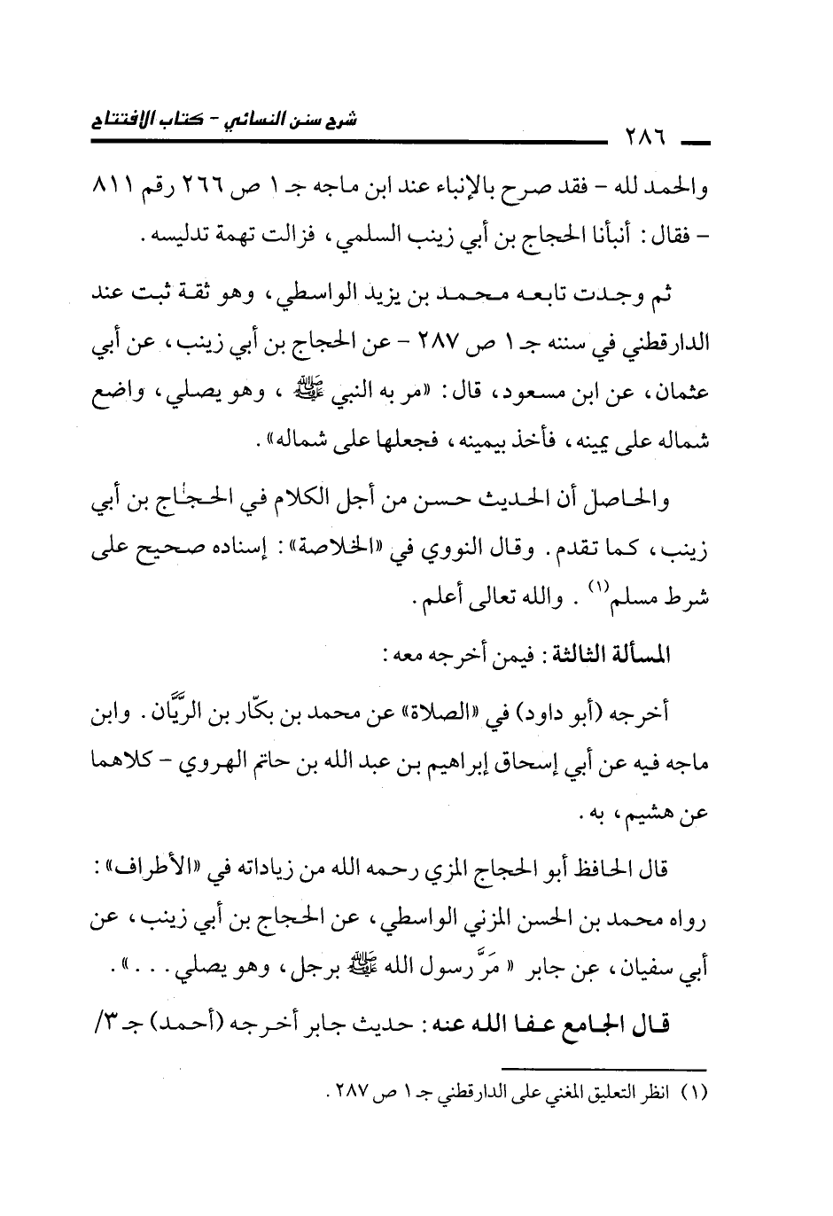 ثم وجدت تابعه محمد بن يزيد الواسطي، وهو ثقة ثبت عند الدارقطني في سننه جـ 1 ص 287 - عن الحجاج بن أبي زينب، عن أبي عثمان، عن ابن مسعود، قال: "مر به النبي -صلى الله عليه وسلم-، وهو يصلي، واضع شماله على يمينه، فأخذ بيمينه، فجعلها على شماله".