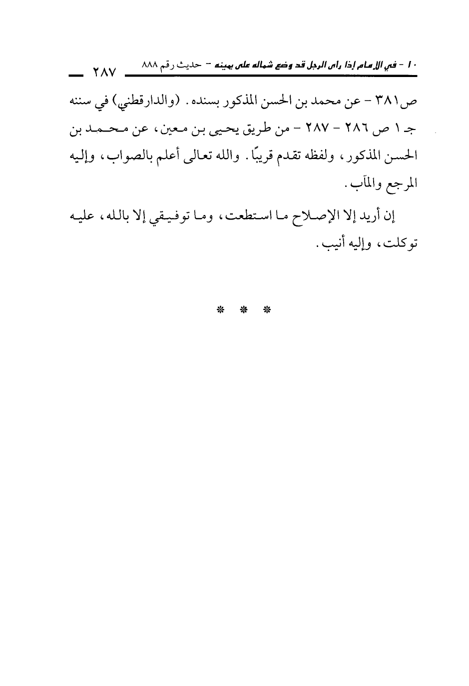 ص 381 - عن محمد بن الحسن المذكور بسنده. (والدارقطني) في سننه جـ 1 ص 286 - 287 - من طريق يحيى بن معين، عن محمد بن الحسن المذكور، ولفظه تقدم قريبًا. والله تعالى أعلم بالصواب، وإليه المرجع والمآب.