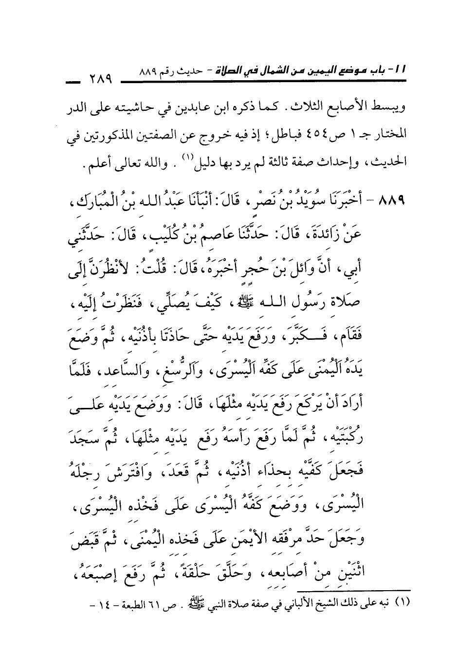 889 - أَخْبَرَنَا سُوَيْدُ بْنُ نَصْرٍ، قَالَ: أَنْبَأَنَا عَبْدُ اللَّهِ بْنُ الْمُبَارَكِ، عَنْ زَائِدَةَ، قَالَ: حَدَّثَنَا عَاصِمُ بْنُ كُلَيْبٍ، قَالَ: حَدَّثَنِي أَبِي، أَنَّ وَائِلَ بْنَ حُجْرٍ أَخْبَرَهُ، قَالَ: قُلْتُ: لأَنْظُرَنَّ إِلَى صَلاَةِ رَسُولِ اللَّهِ -صلى الله عليه وسلم- كَيْفَ يُصَلِّي، فَنَظَرْتُ إِلَيْهِ، فَقَامَ، فَكَبَّرَ، وَرَفَعَ يَدَيْهِ حَتَّى حَاذَتَا بِأُذُنَيْهِ، ثُمَّ وَضَعَ يَدَهُ الْيُمْنَى عَلَى كَفِّهِ الْيُسْرَى، وَالرُّسْغِ، وَالسَّاعِدِ، فَلَمَّا أَرَادَ أَنْ يَرْكَعَ رَفَعَ يَدَيْهِ مِثْلَهَا، قَالَ: وَوَضَعَ يَدَيْهِ عَلَى رُكْبَتَيْهِ، ثُمَّ لَمَّا رَفَعَ رَأْسَهُ رَفَعَ يَدَيْهِ مِثْلَهَا، ثُمَّ سَجَدَ فَجَعَلَ كَفَّيْهِ بِحِذَاءِ أُذُنَيْهِ، ثُمَّ قَعَدَ، وَافْتَرَشَ رِجْلَهُ الْيُسْرَى، وَوَضَعَ كَفَّهُ الْيُسْرَى عَلَى فَخِذِهِ الْيُسْرَى، وَجَعَلَ حَدَّ مِرْفَقِهِ الأَيْمَنِ عَلَى فَخِذِهِ الْيُمْنَى، ثُمَّ قَبَضَ اثْنَتَيْنِ مِنْ أَصَابِعِهِ، وَحَلَّقَ حَلْقَةً، ثُمَّ رَفَعَ إِصْبَعَهُ،