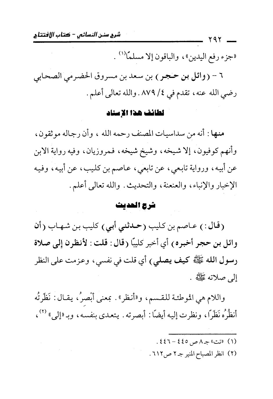 (قال:) عاصم بن كليب (حدثني أبي) كليب بن شهاب (أن وائل بن حجر أخبره) أي أخبر كليباً (قال: قلت: لأنظرن إِلى صلاة رسول الله -صلى الله عليه وسلم- كيف يصلي) أي قلت في نفسي، وعزمت على النظر إلى صلاته -صلى الله عليه وسلم-.