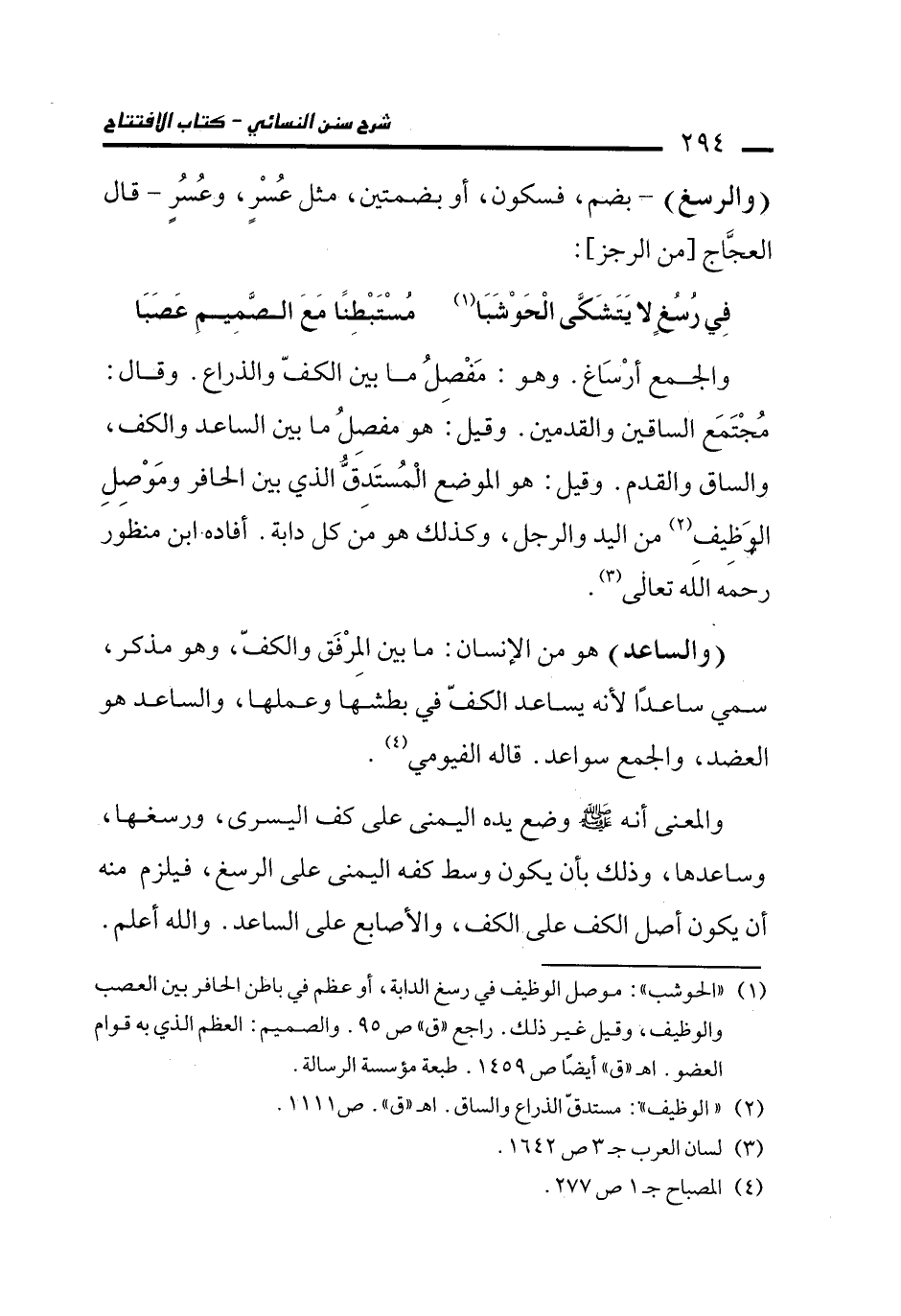 والجمع أرْسَاغ. وهو: مَفْصِلُ ما بين الكفّ والذراع. وقال: مُجْتَمَع الساقين والقدمين. وقيل: هو مفصِلُ ما بين الساعد والكف، والساق والقدم. وقيل: هو الموضع الْمُستَدِقُّ الذي بين الحافر ومَوْصِلِ الوَظِيف (¬2) من اليد والرجل، وكذلك هو من كل دابة. أفاده ابن منظور رحمه الله تعالى (¬3).
