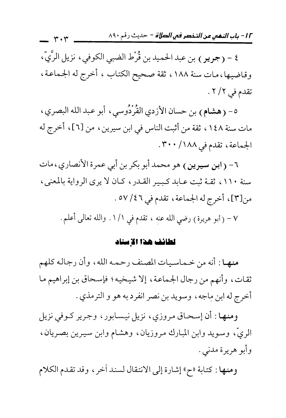 ومنها: أن إسحاق مروزي، نزيل نيسابور، وجرير كوفي نزيل الريّ، وسويد وابن المبارك مروزيان، وهشام وابن سيرين بصريان، وأبو هريرة مدني.