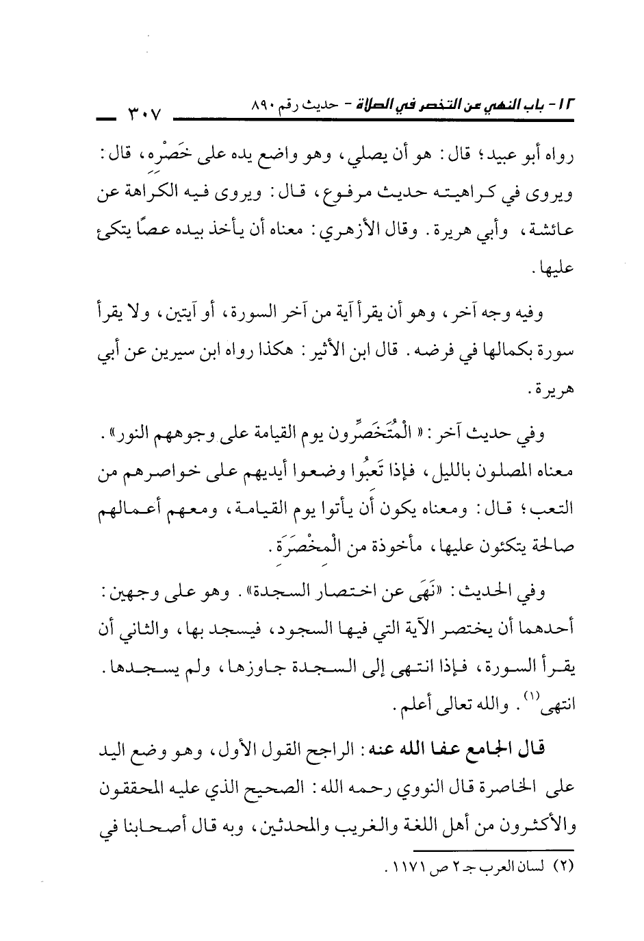 قال الجامع عفا الله عنه: الراجح القول الأول، وهو وضع اليد على الخاصرة قال النووي رحمه الله: الصحيح الذي عليه المحققون والأكثرون من أهل اللغة والغريب والمحدثين، وبه قال أصحابنا في