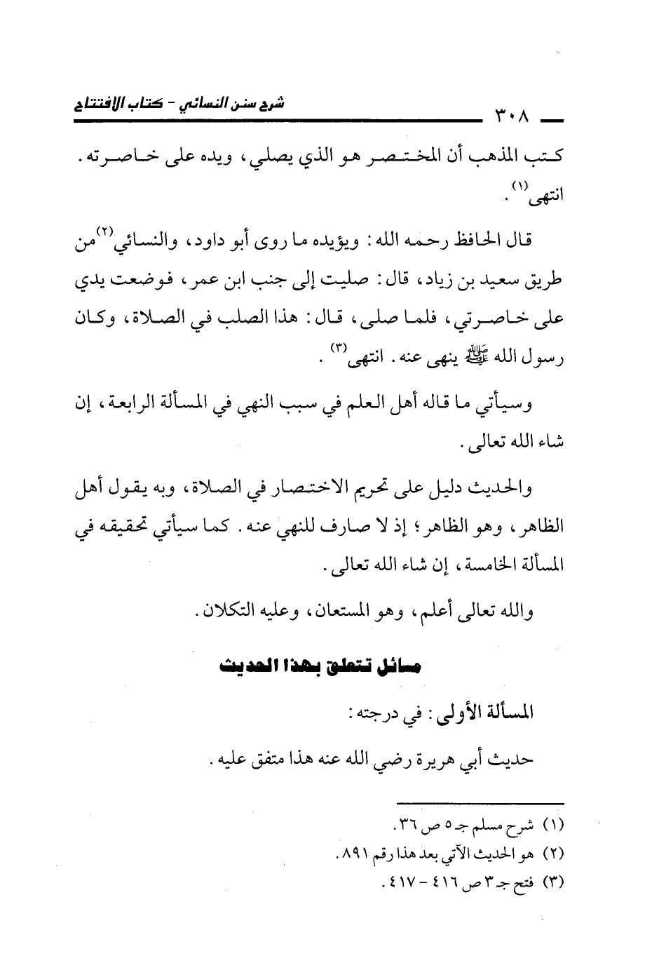 قال الحافظ رحمه الله: ويؤيده ما روى أبو داود، والنسائي (¬2) من طريق سعيد بن زياد، قال: صليت إلى جنب ابن عمر، فوضعت يدي على خاصرتي، فلما صلى، قال: هذا الصلب في الصلاة، وكان رسول الله -صلى الله عليه وسلم- ينهى عنه. انتهى (¬3).