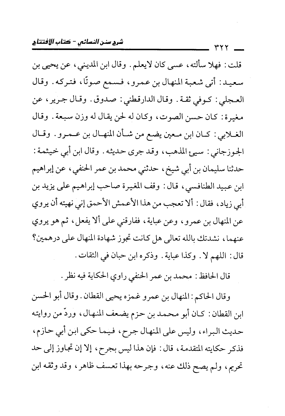 وقال الحاكم: المنهال بن عمرو غمزه يحيى القطان. وقال أبو الحسن ابن القطان: كان أبو محمد بن حزم يضعف المنهال، وردّ من روايته حديث البراء، وليس على المنهال جرح، فيما حكى ابن أبي حازم، فذكر حكايته المتقدمة، قال: فإن هذا ليس بجرح، إلا إن تجاوز إلى حد تحريم، ولم يصح ذلك عنه، وجرحه بهذا تعسف ظاهر، وقد وثقه ابن