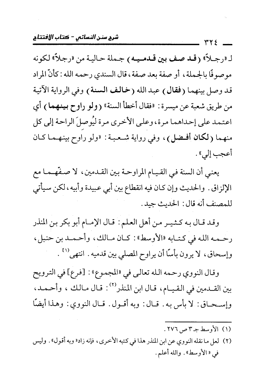 لـ"رجلًا" (قد صف بين قدميه) جملة حالية من "رجلًا" لكونه موصوفًا بالجملة، أو صفة بعد صفة، قال السندي رحمه الله: كأنّ المراد قد وصل بينهما (فقال) عبد الله (خالف السنة) وفي الرواية الآتية من طريق شعبة عن ميسرة: "فقال أخطأ السنة" (ولو راوح بينهما) أي اعتمد على إحداهما مرة، وعلى الأخرى مرة ليُوصِلَ الراحة إلى كل منهما (لكان أفضل)، وفي رواية شعبة: "ولو راوح بينهما كان أعجب إلي".