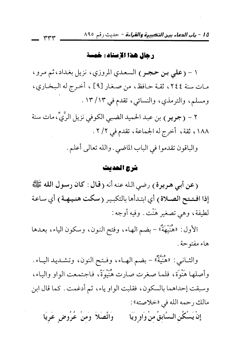 (عن أبي هريرة) رضي الله عنه أنه (قال: كان رسول الله - صلى الله عليه وسلم - إِذا افتتح الصلاة) أي ابتدأها بالتكبير (سكت هنيهة) أي ساعة لطيفة، وهي تصغير هَنْت. وفيه أوجه: