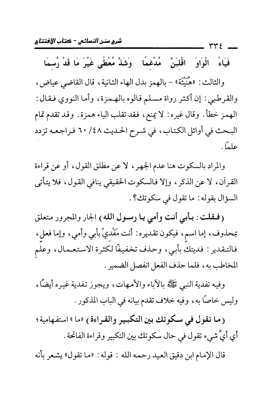 والثالث: "هُنَيْئَة" -بالهمز بدل الهاء الثانية، قال القاضي عياض، والقرطبي: إن أكثر رواة مسلم قالوه بالهمزة، وأما النووي فقال: الهمز خطأ. وقال غيره: لا يمنع، فقد تقلب الياء همزة. وقد تقدم تمام البحث في أوائل الكتاب، في شرح الحديث 48/ 60 فراجعه تزدد علمًا.